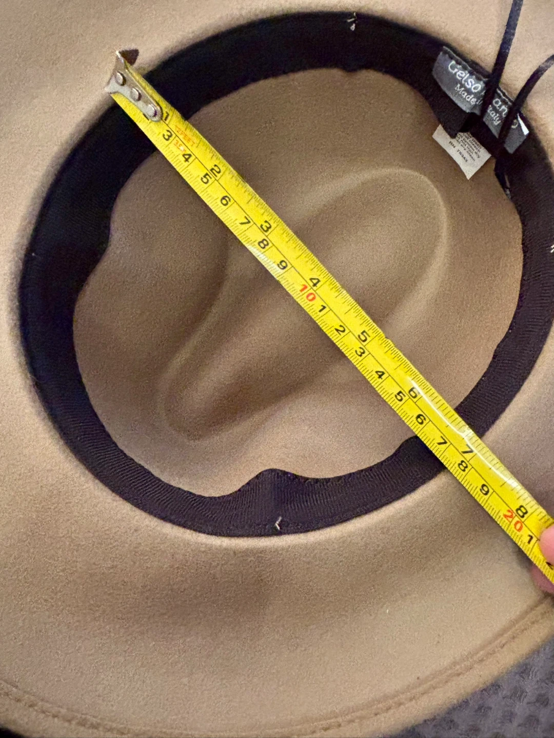 This stylish fedora hat is made of 100% wool and crafted in Italy. It features a decorative gold chain band around the crown. The hat's inner circumference measures approximately 7 in