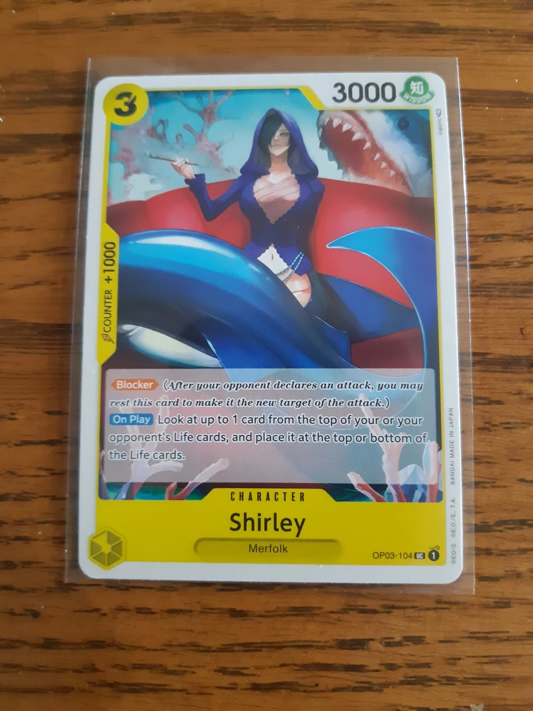 Selling a Shirley OP03-104 card from the One Piece Card Game! This is a character card with the ability 'Blocker'. It has a cost of 3 and power of 3000.