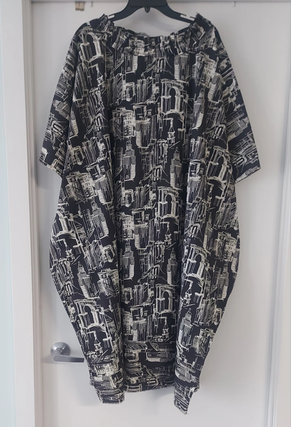 A flowy long dress with pockets featuring a black and white cityscape print, strechy fabric, It has a round neckline with a gathered detail and short sleeves. This dress drapes loosely for a comfortable fit. Perfect for a casual outing!