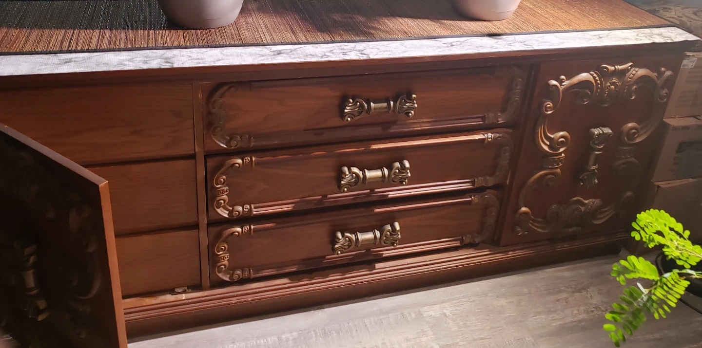 This beautiful dresser features three drawers with ornate brass pulls and decorative carved details on the side panels (with 3 hidden drawers at each side). It's made of rich, dark wood. Wood material.