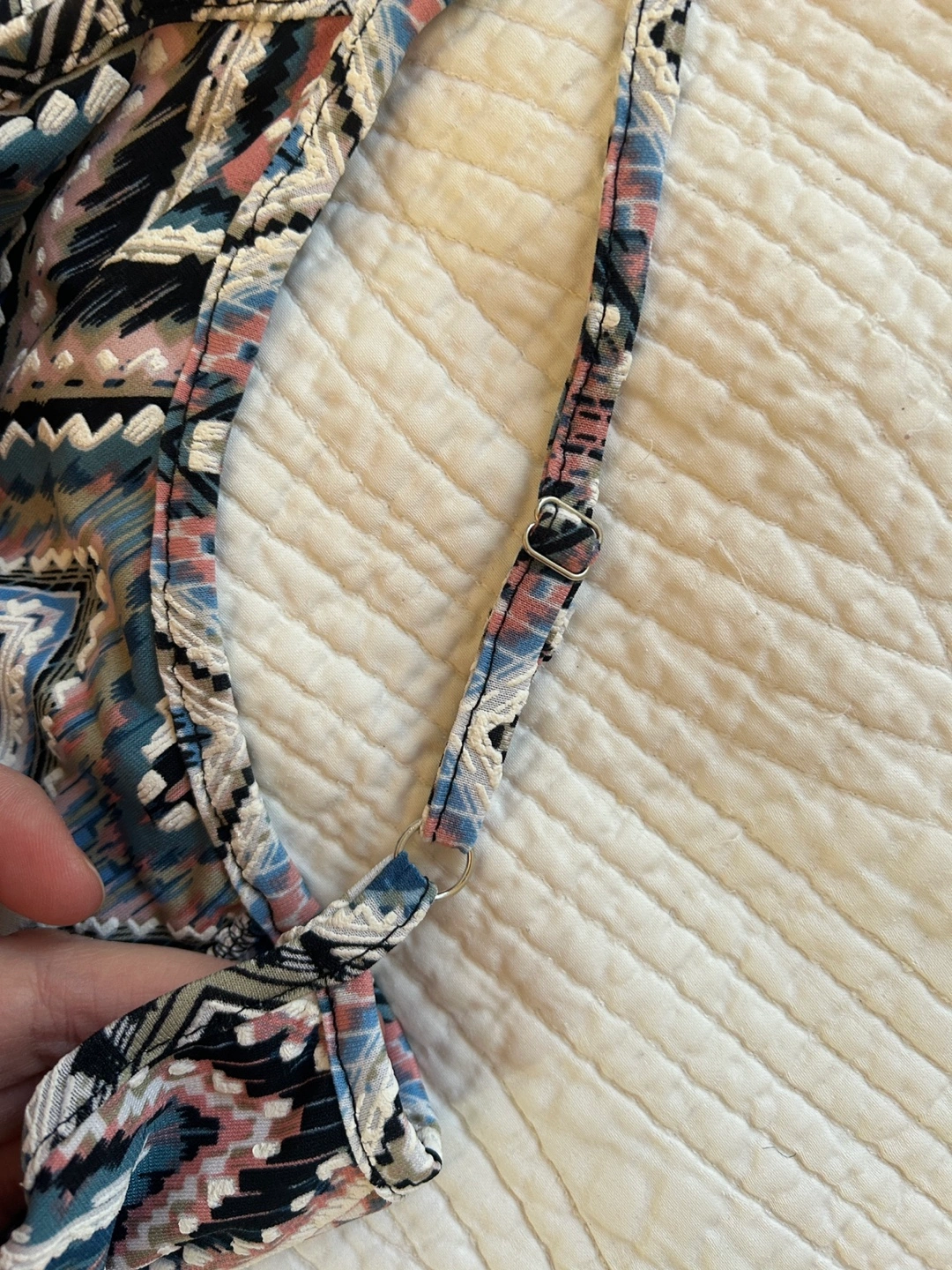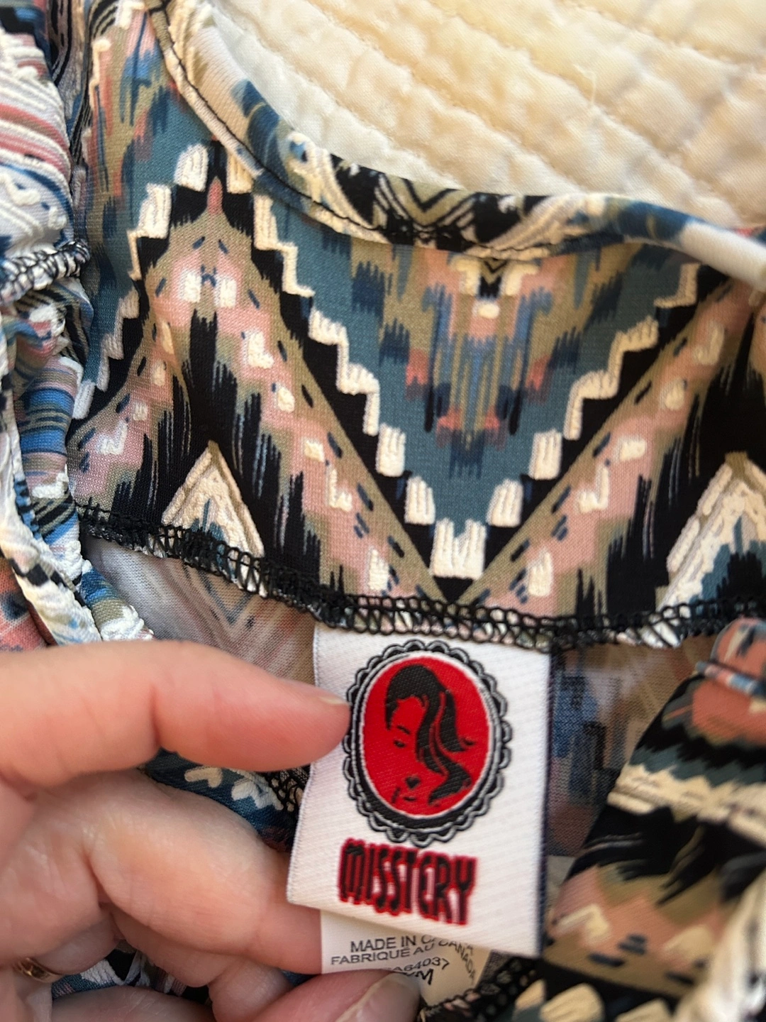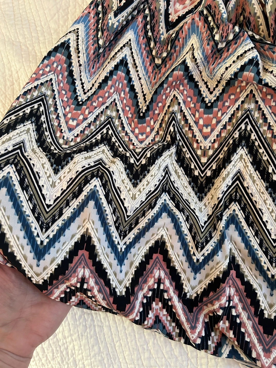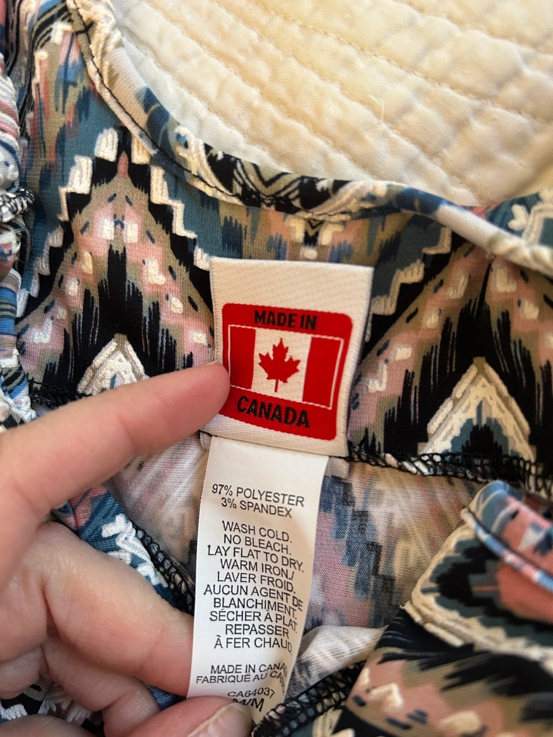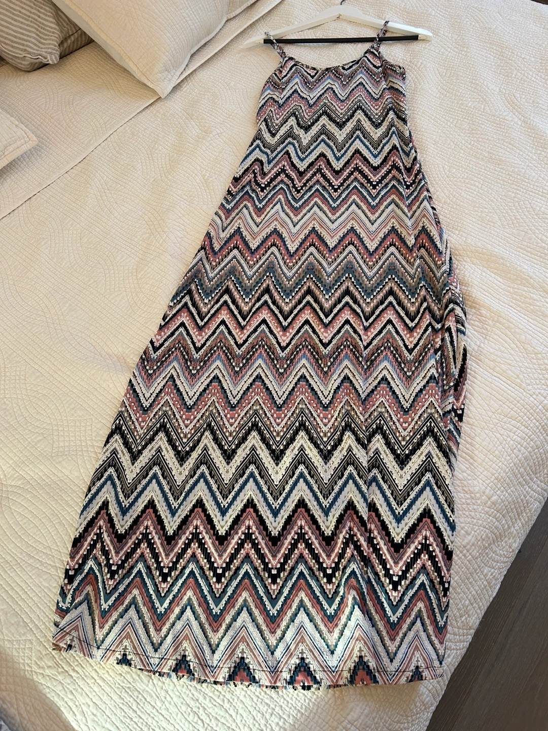 Gorgeous maxi dress with a vibrant geometric print. Made in Canada. Adjustable straps. Size Medium. The fabric is very flattering. I never wore it—impulse buy because it’s so pretty but it’s just not me.