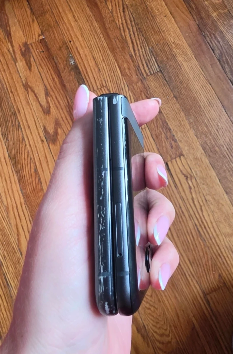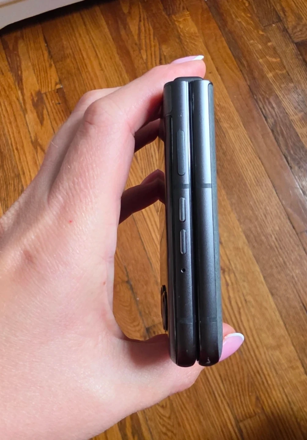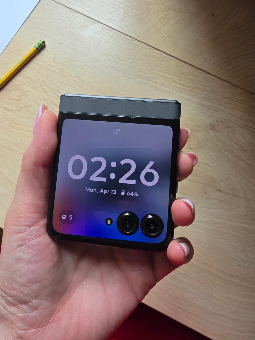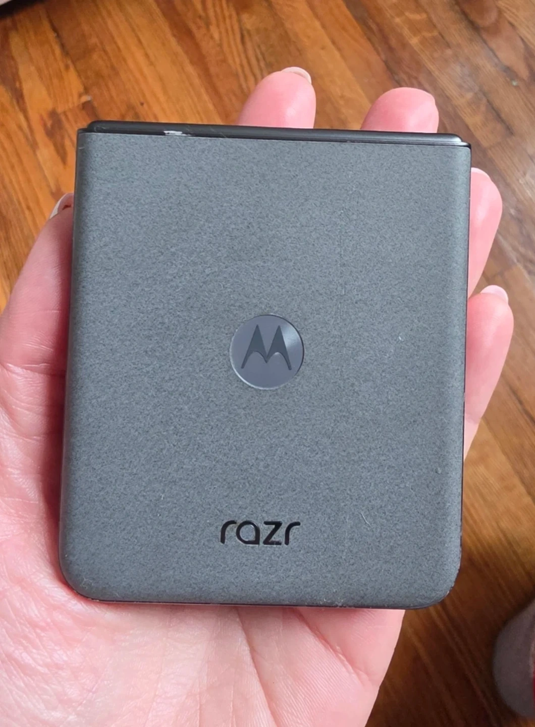 Motorola Razr folding smartphone. Clamshell design. It's a smart and compact phone that folds in half! Screen is bright and clear.