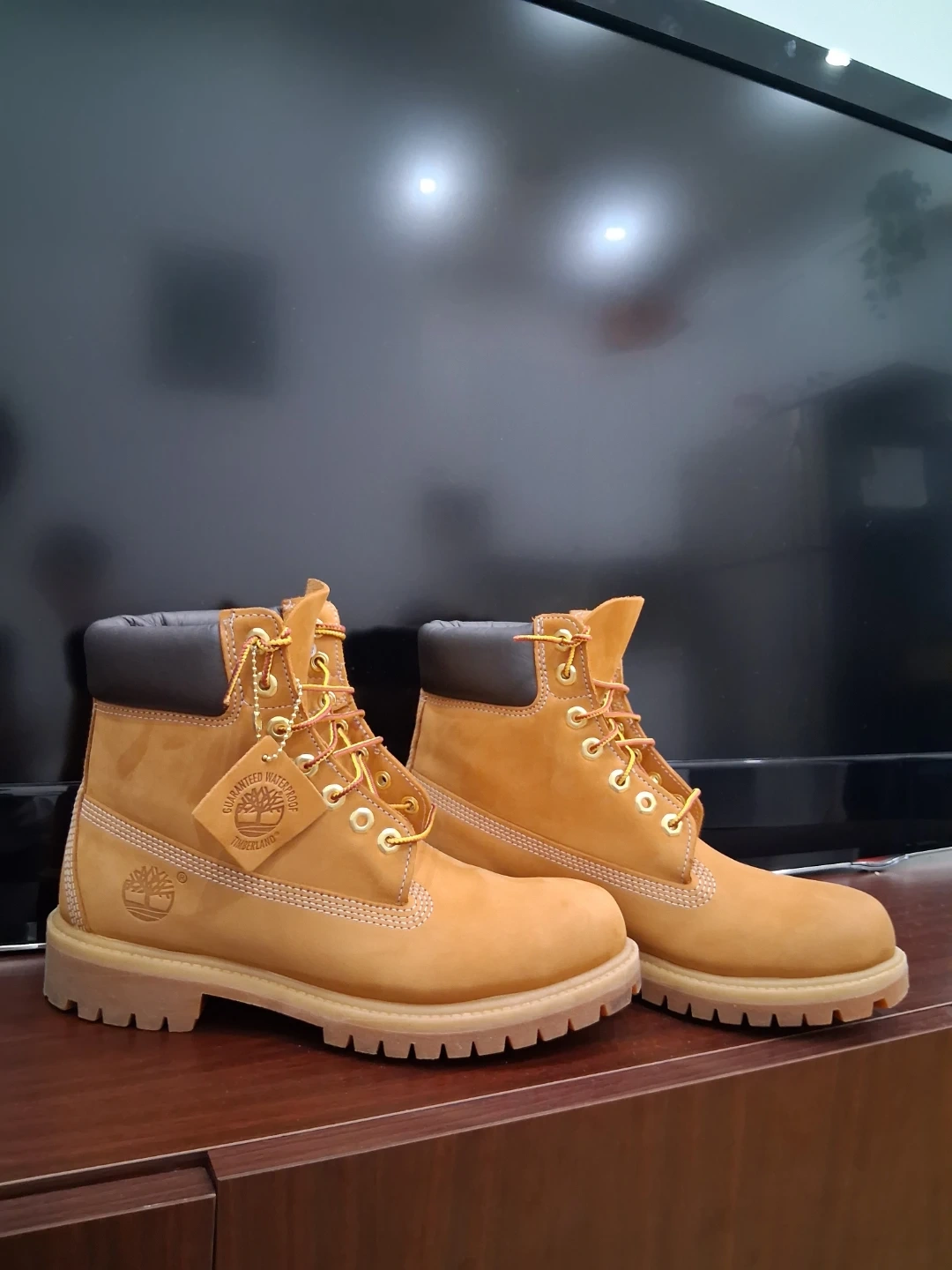 Timberland classic yellow nubuck boots. Waterproof construction. Lace-up closure with metal eyelets. Lugged rubber sole.