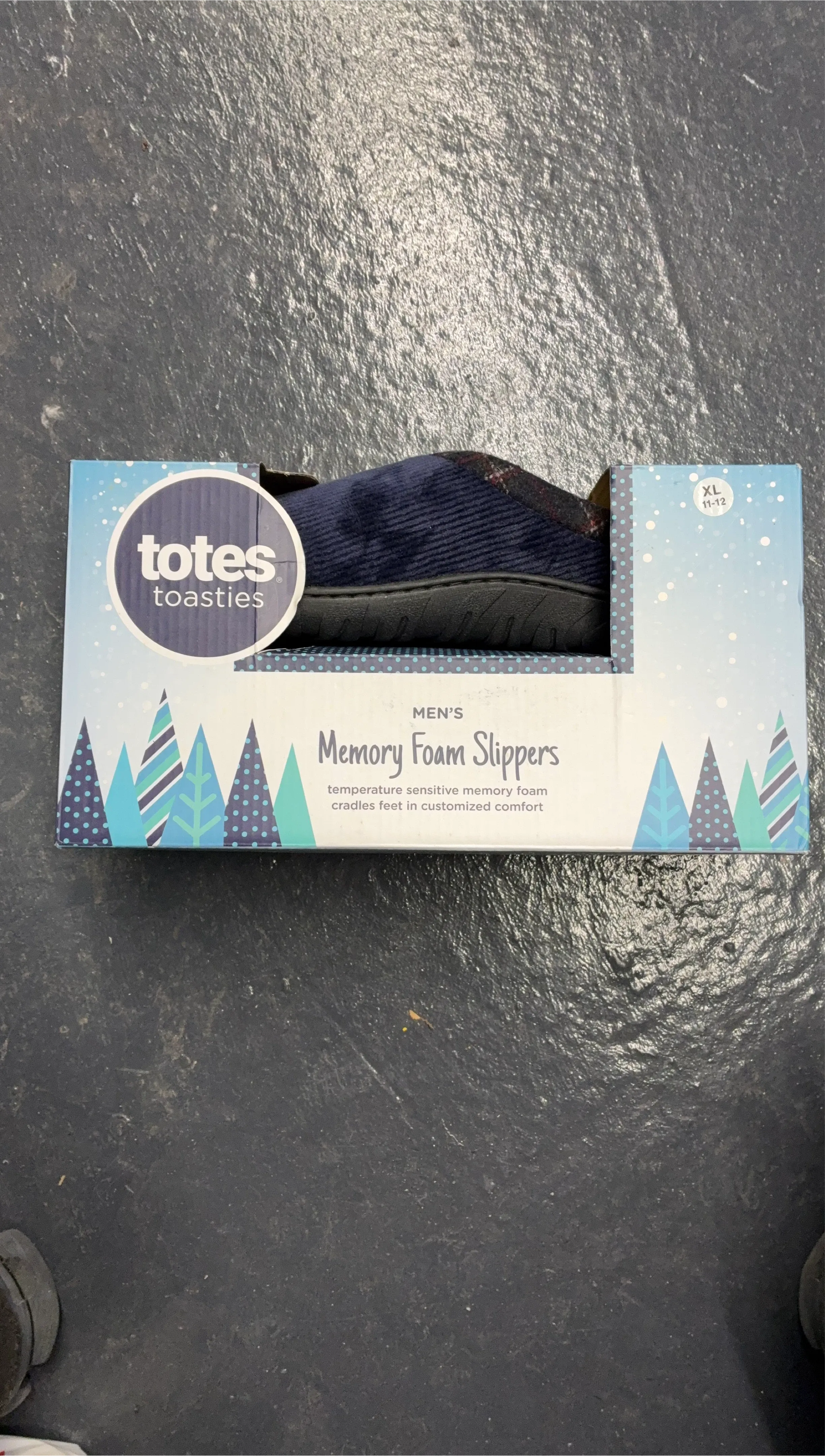 These Totes Toasties memory foam slippers are designed for men. They feature temperature-sensitive memory foam that cradles feet in customized comfort. The size is XL, fitting shoe sizes 11-12.