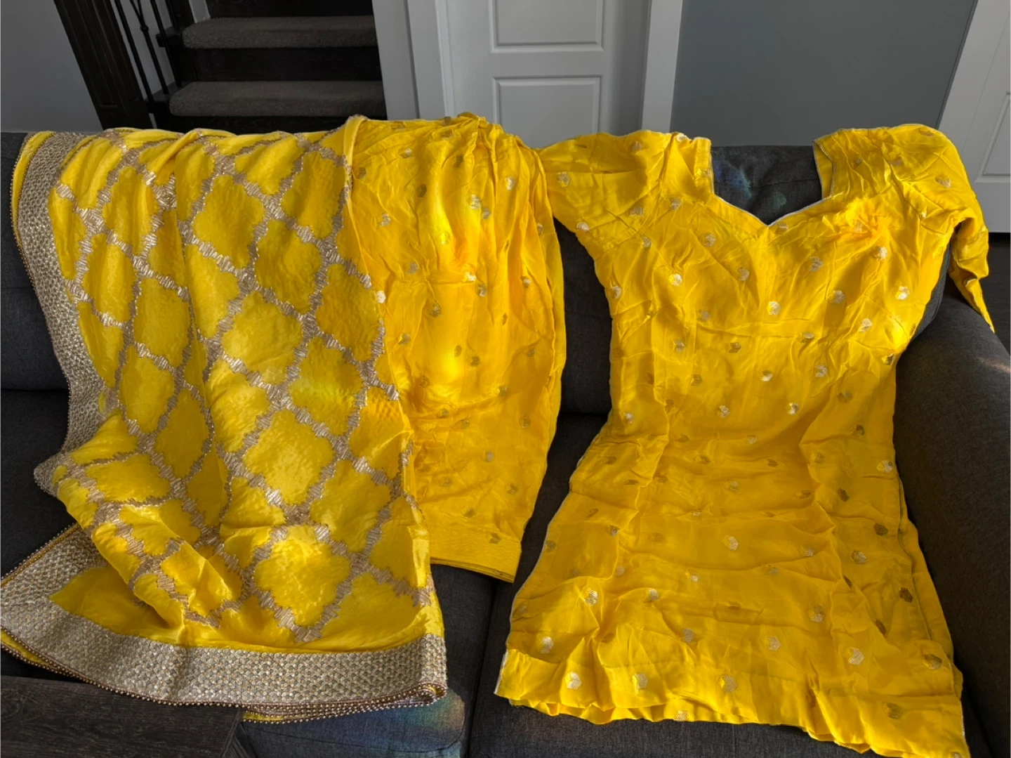 A lovely yellow salwar kameez set with a matching dupatta. The outfit has a V-neckline and features a delicate all-over print with gold accents. The dupatta is also adorned with a coordinating embroidered border. Material appears to be a lightweight synthetic blend.