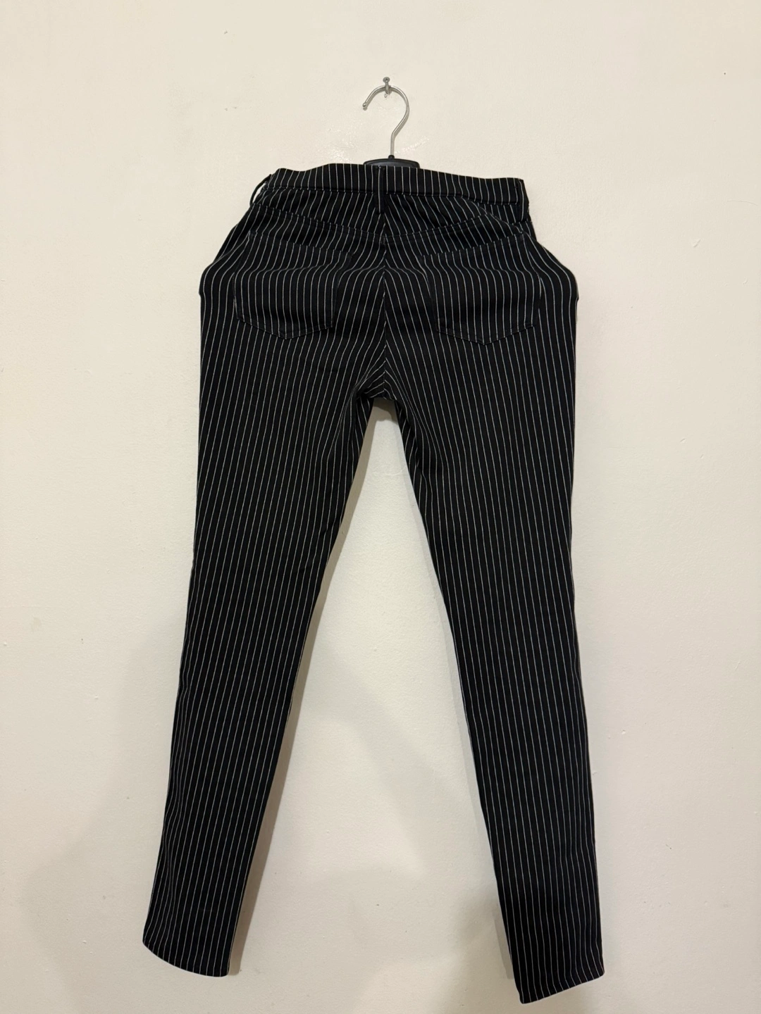 Black and white pinstripe pants. Slim fit.