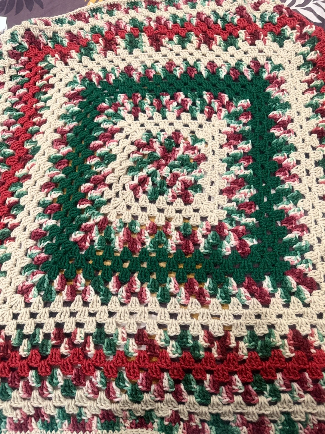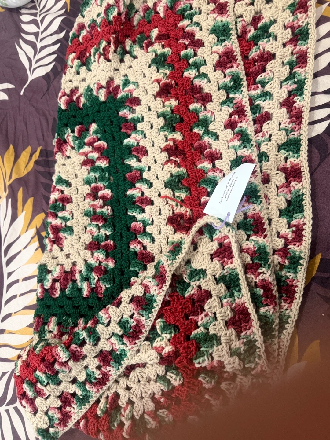 This is a lovely handmade crochet blanket or scarf! It's crafted with a festive Christmas color scheme of red, green, and cream. The granny square pattern is a classic and cozy choice. It would make a great addition to your holiday decor or a thoughtful gift!