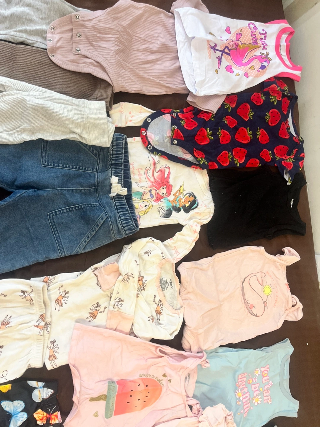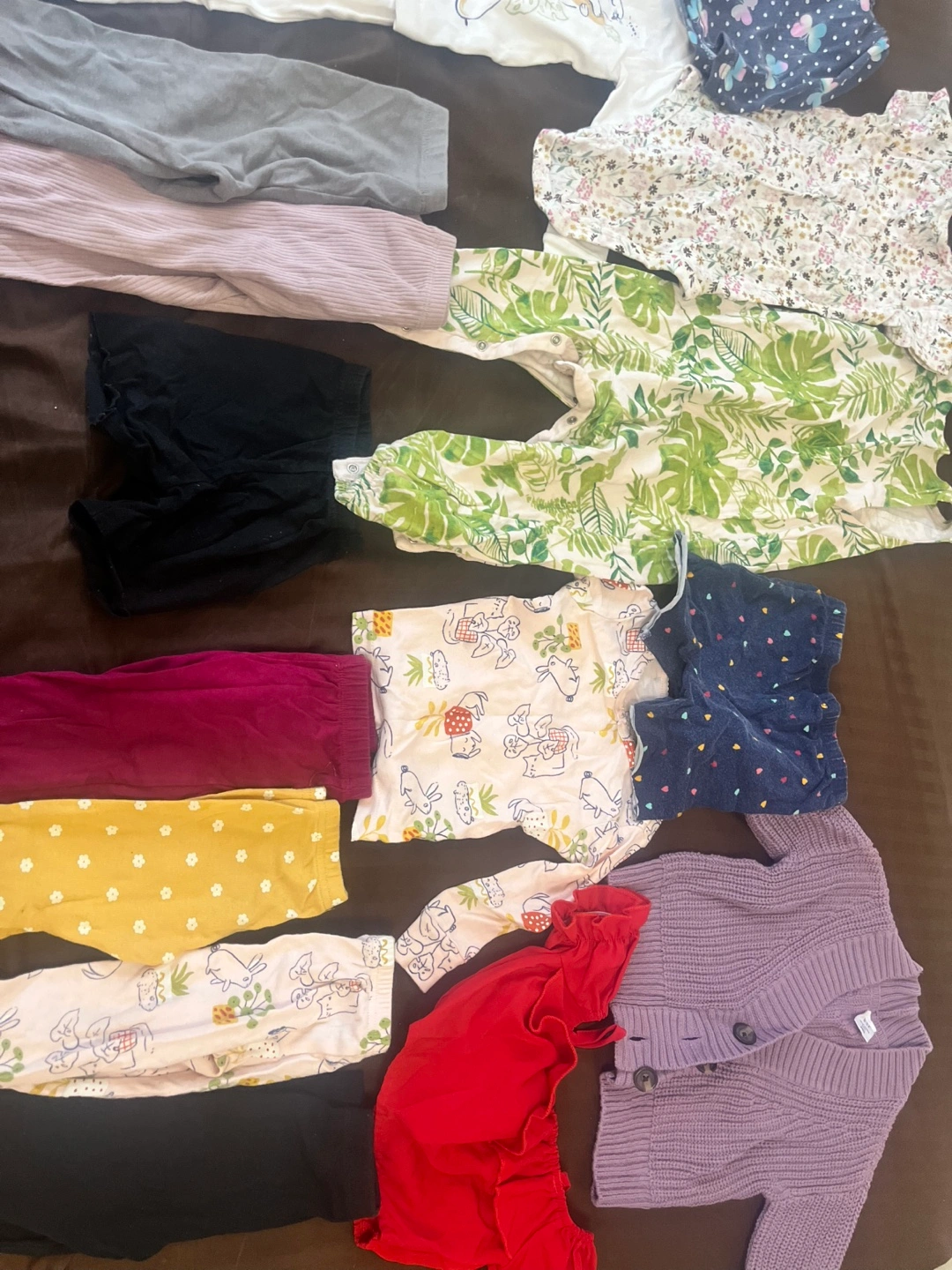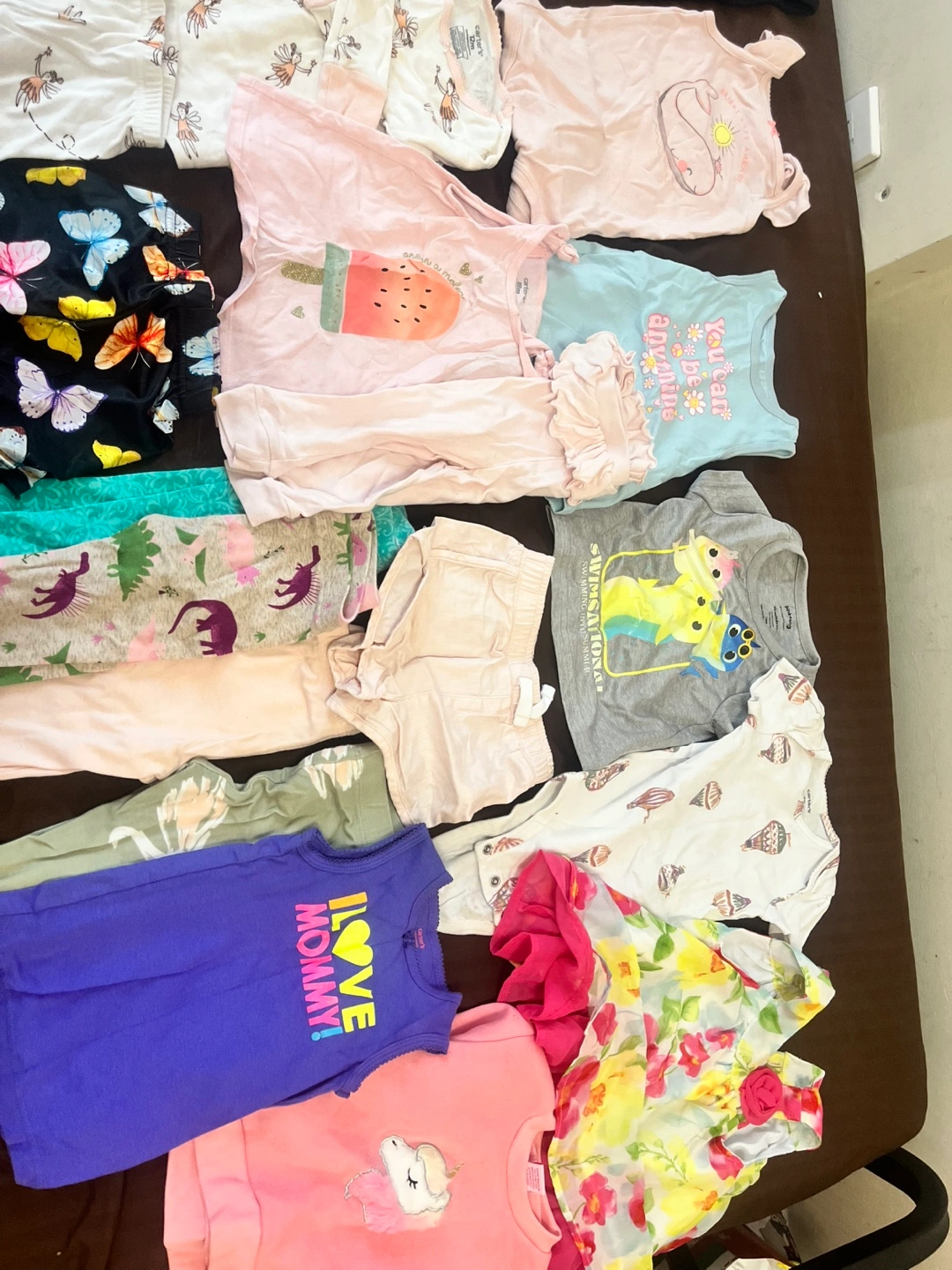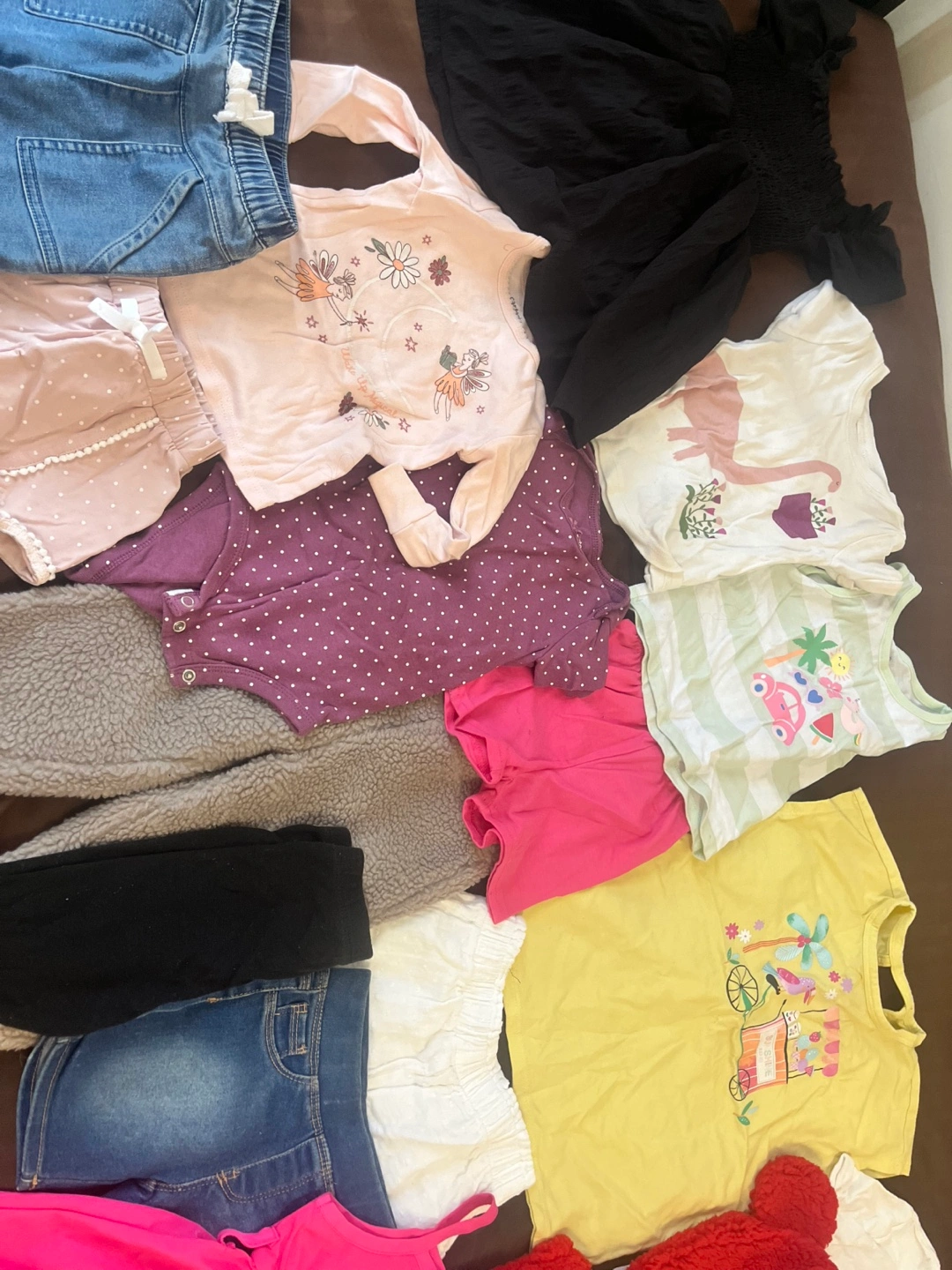 Bundle of baby girl clothes in various sizes. Includes tops, pants, shorts, dresses, and a cardigan. All items are in good condition. Used