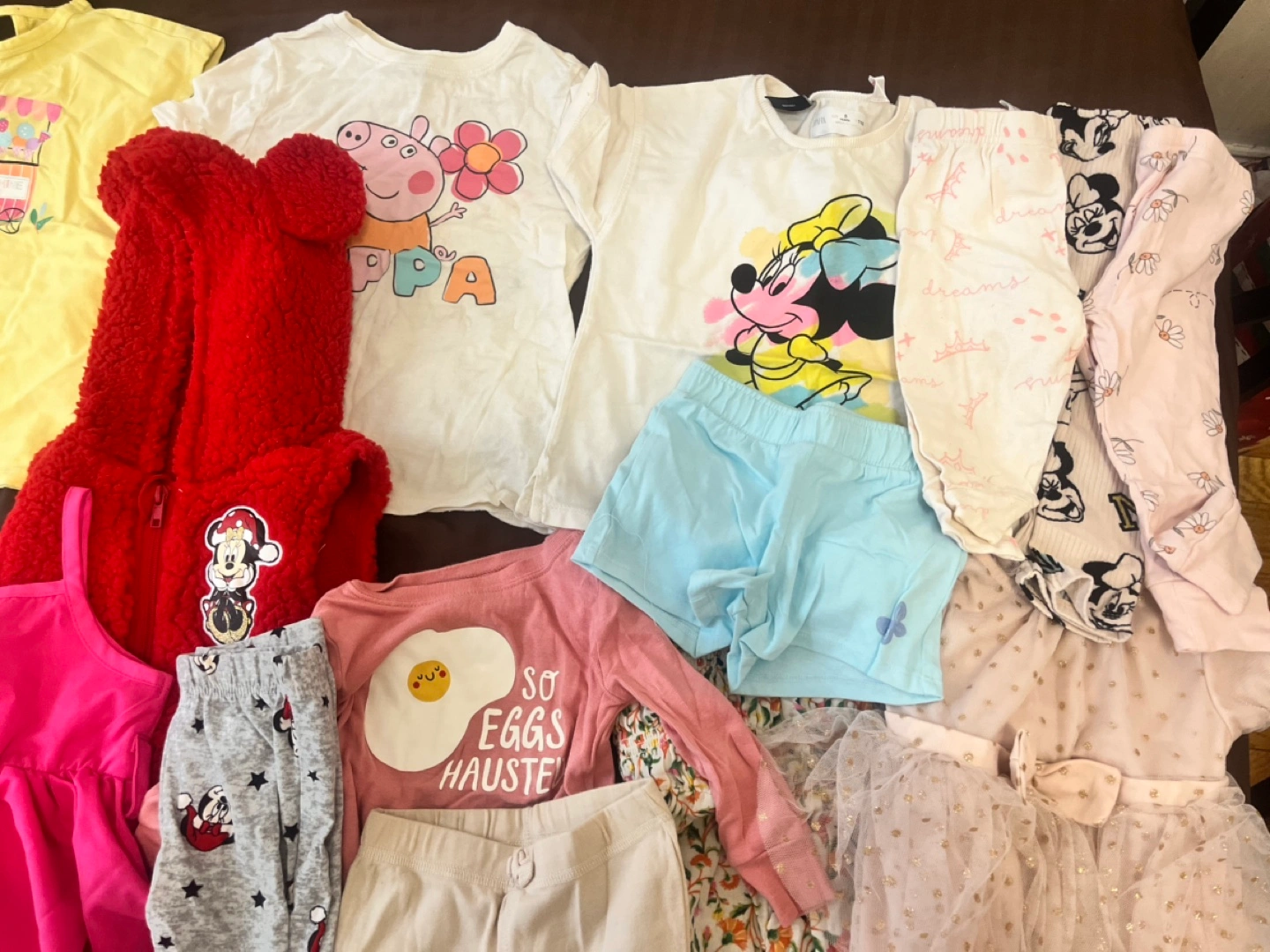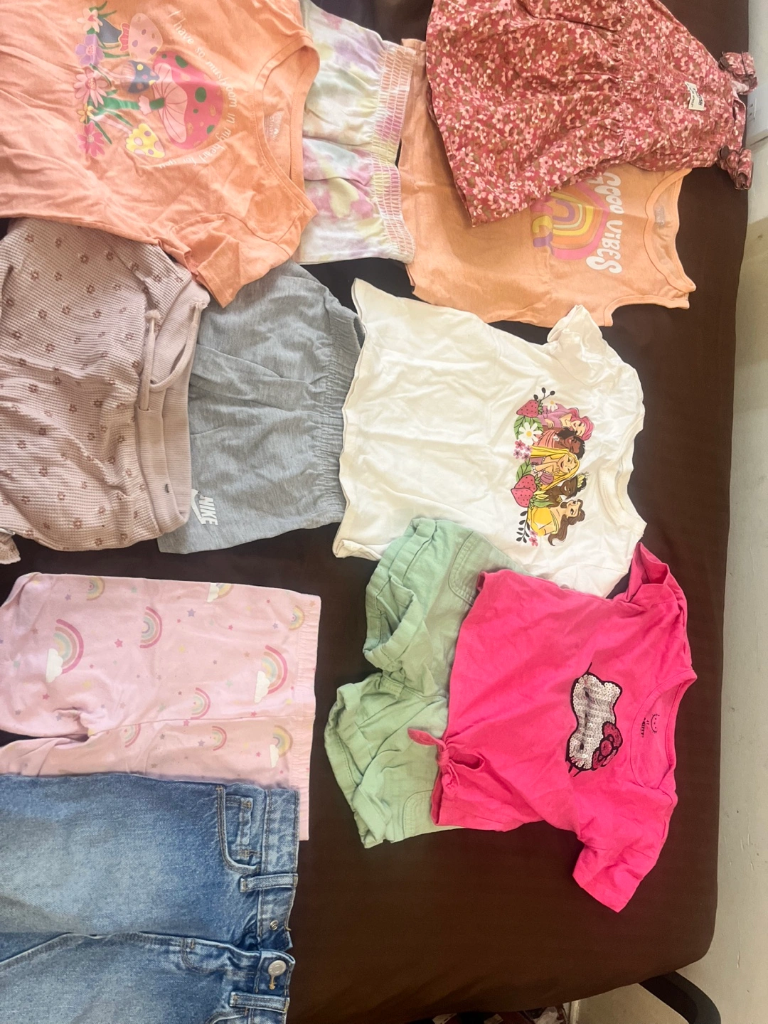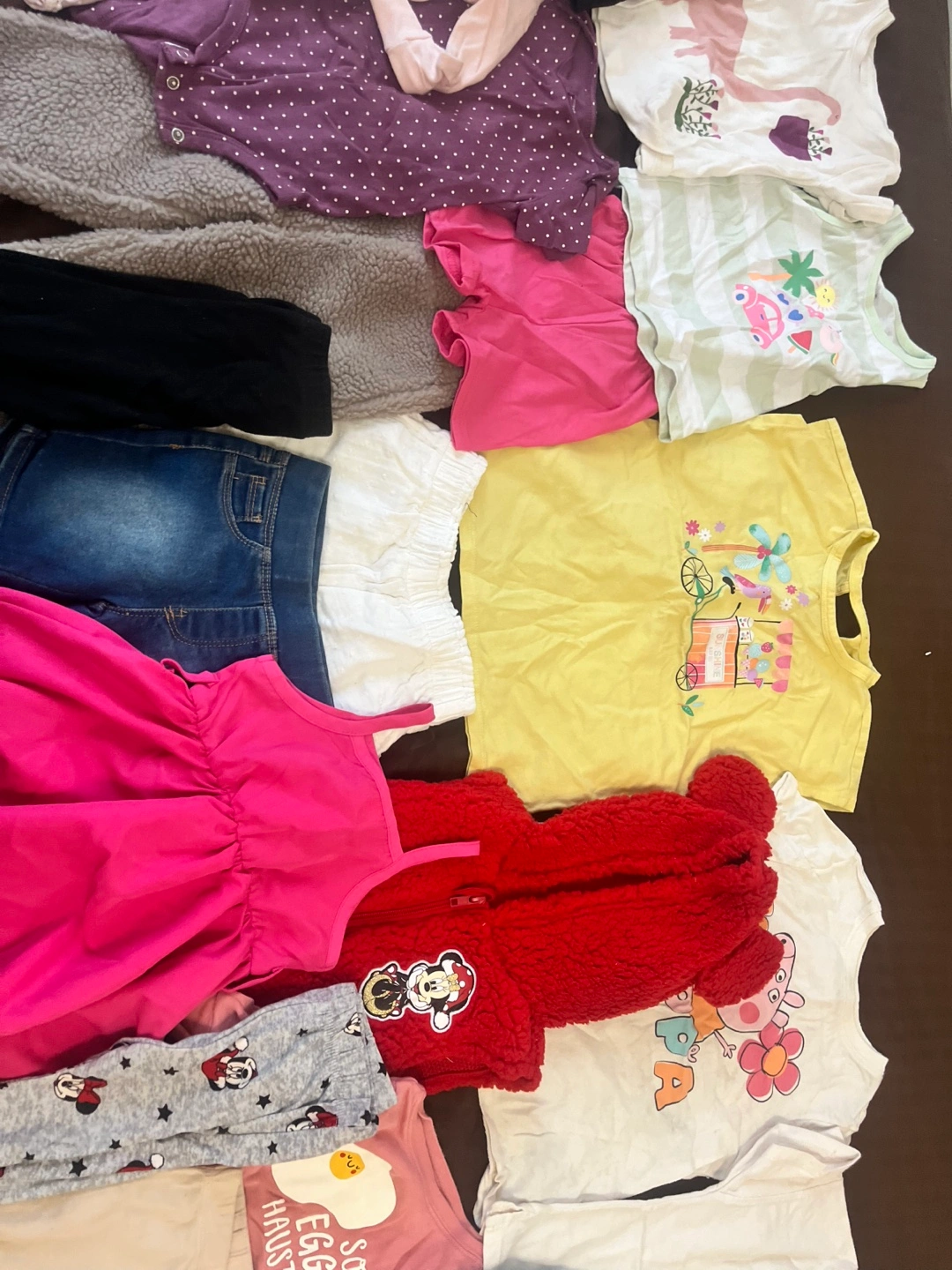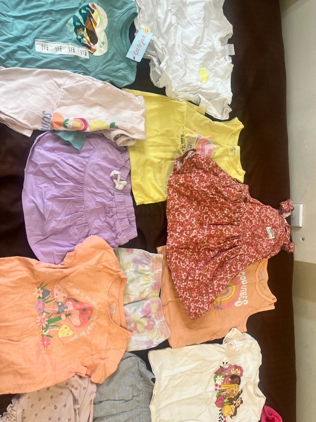 Bundle of baby girl clothes in various sizes. Includes tops, pants, shorts, dresses, and a cardigan. All items are in good condition. Used