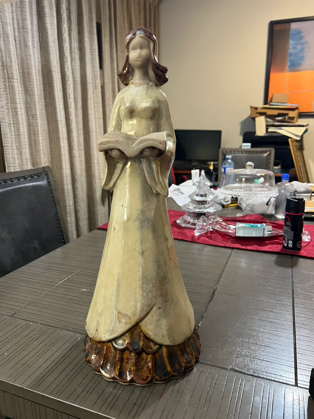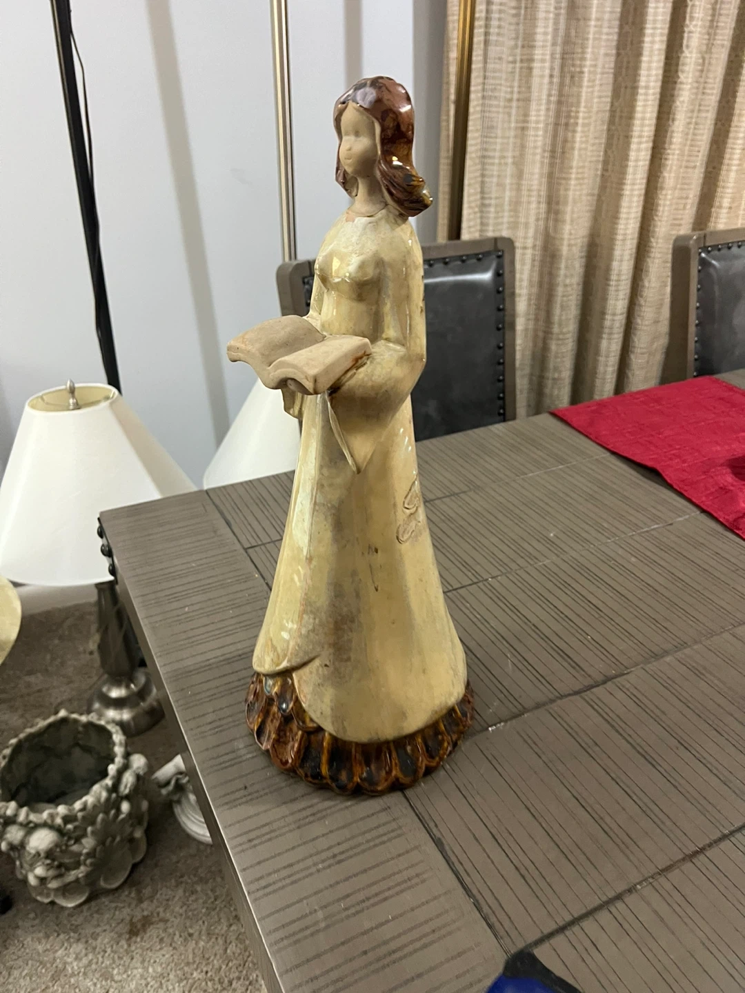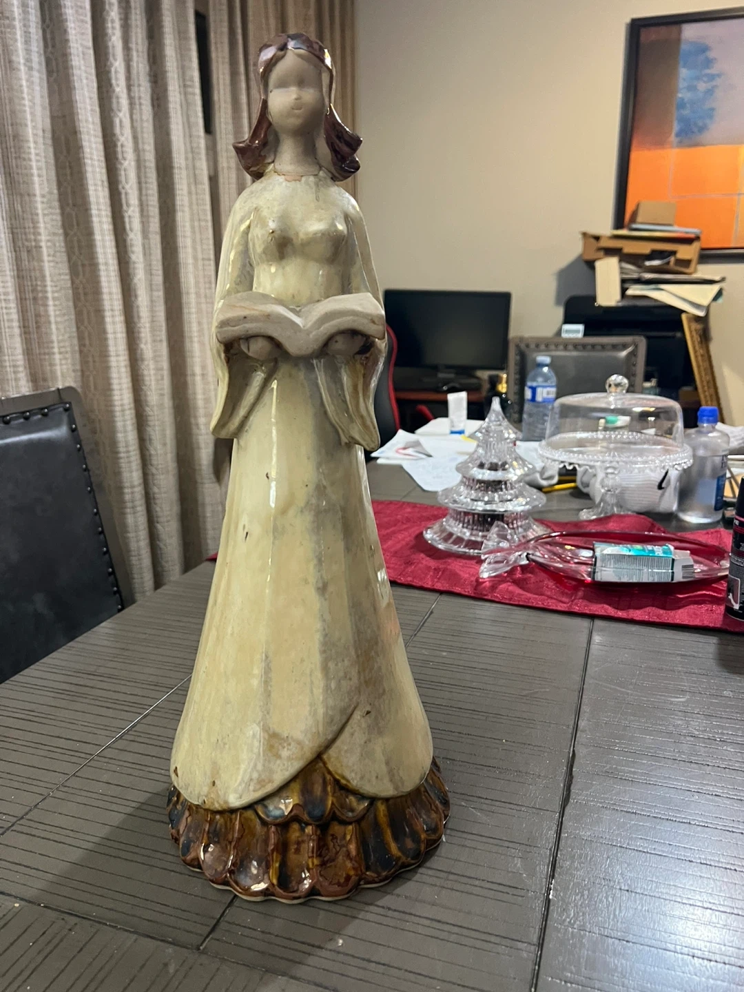 This is a used decorative ceramic figurine of an angel holding a book. It has a light cream-coloured dress with a darker, textured base. The figurine's hair is brown and it has a gentle expression.