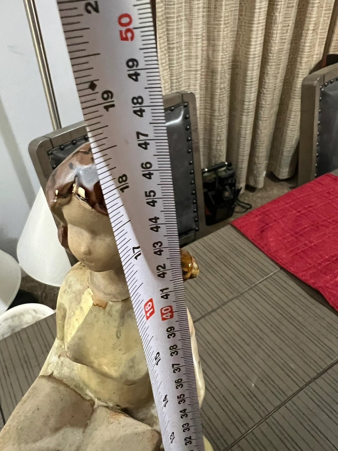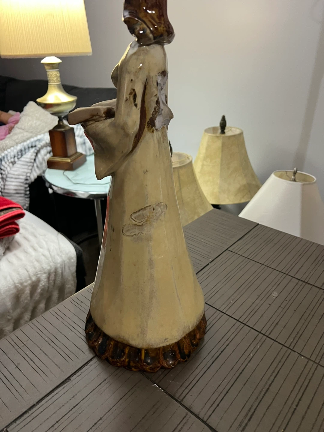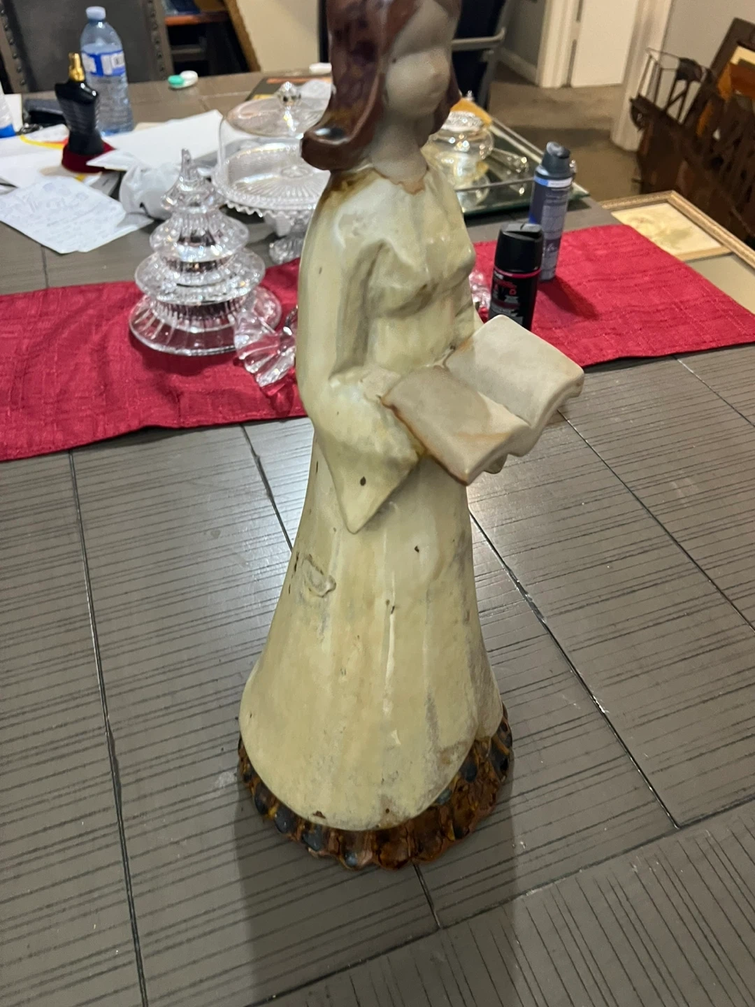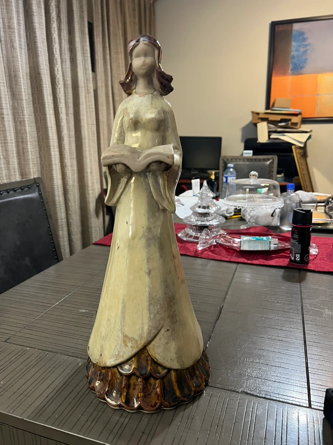 This is a used decorative ceramic figurine of an angel holding a book. It has a light cream-coloured dress with a darker, textured base. The figurine's hair is brown and it has a gentle expression.