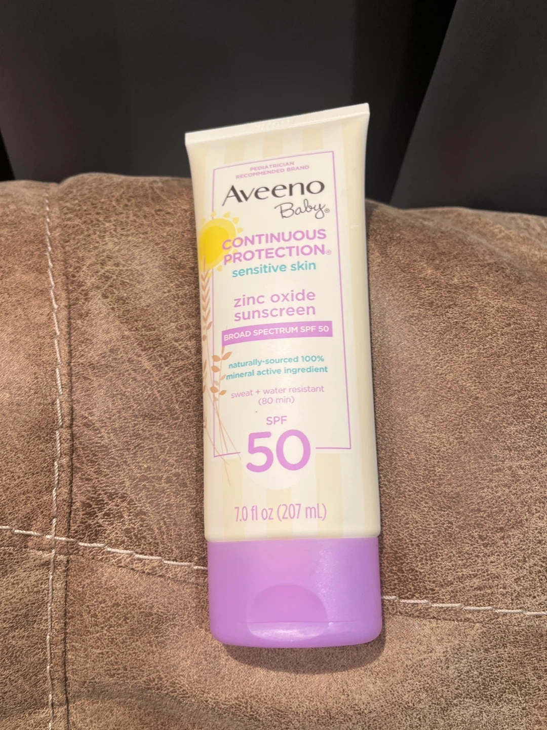 Aveeno Baby Continuous Protection sunscreen! It's SPF 50 and designed for sensitive skin. This sunscreen is made with naturally-sourced 100% mineral active ingredients and is sweat and water resistant for up to 80 minutes. The tube contains 7.0 fl oz (207 mL).