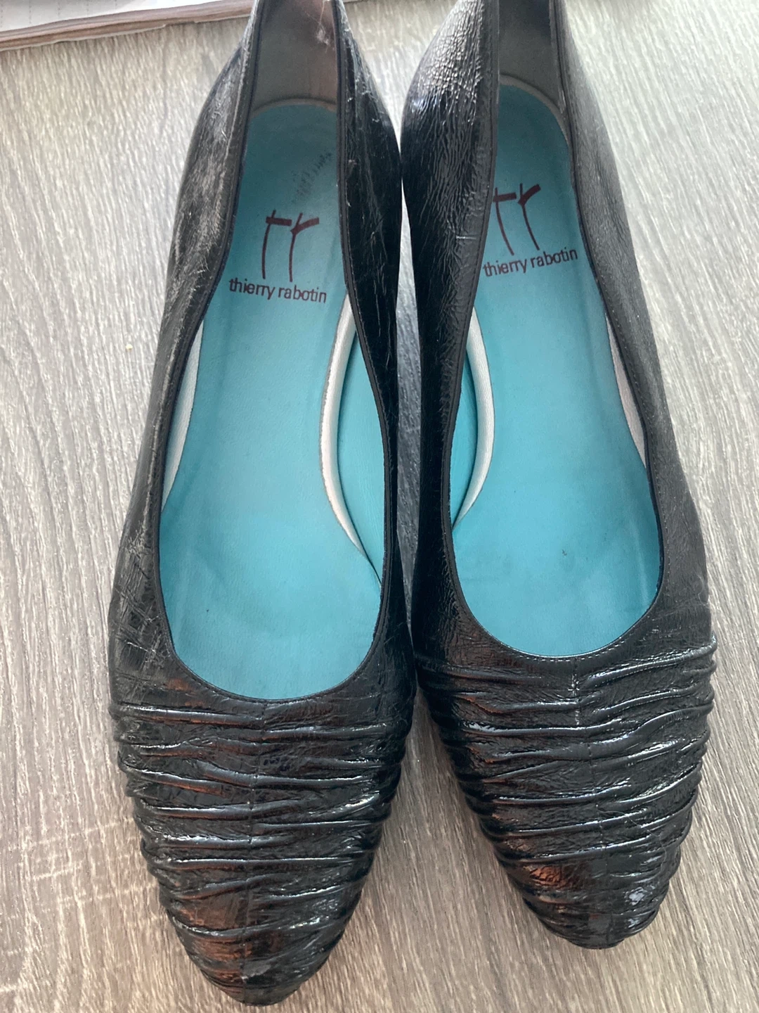 Classic Thierry Rabotin black leather ballet flats with a comfortable fit. These Italian-made shoes are crafted from genuine leather with a distinctive textured toe. Perfect for everyday wear or dressing up.