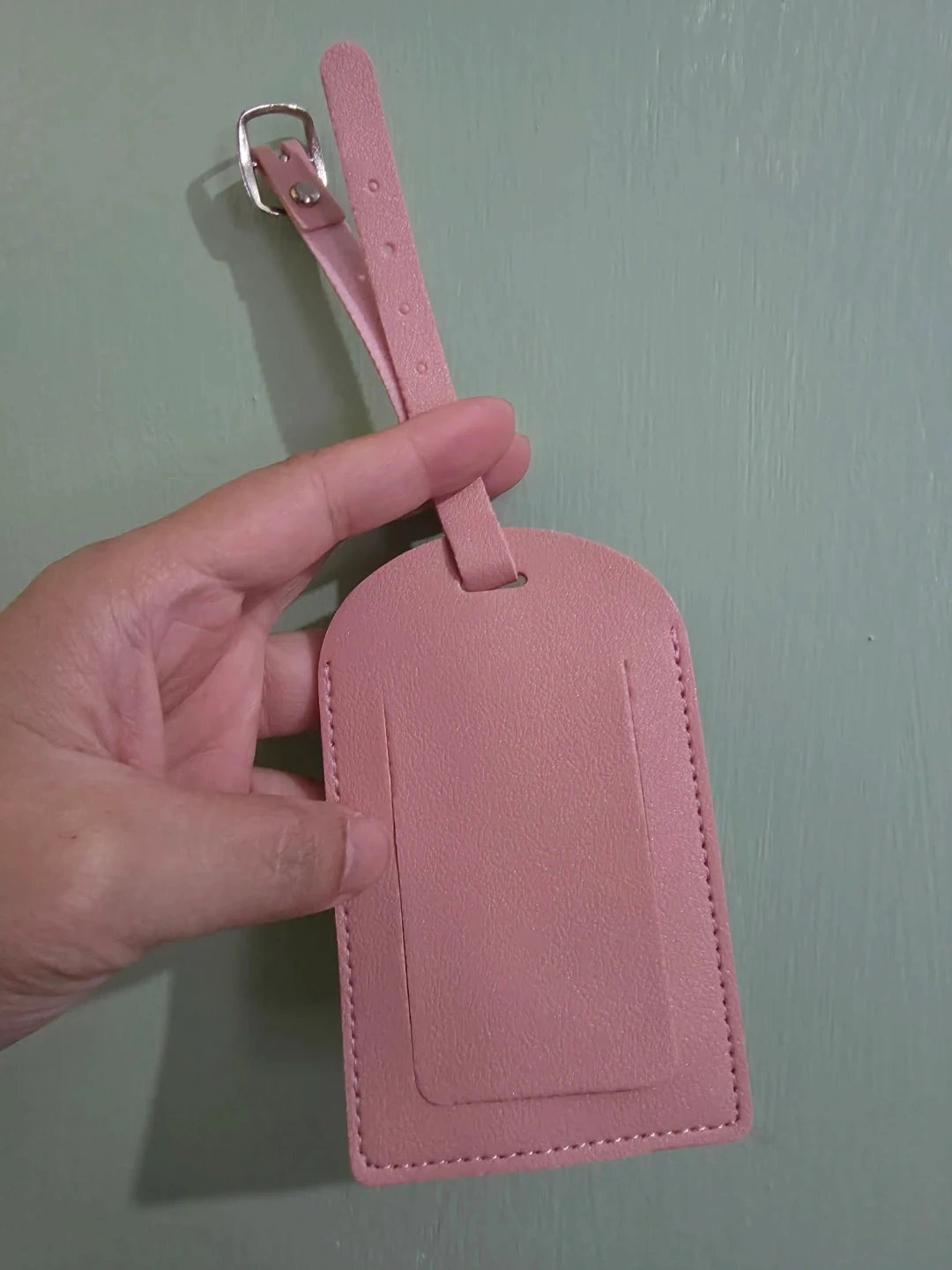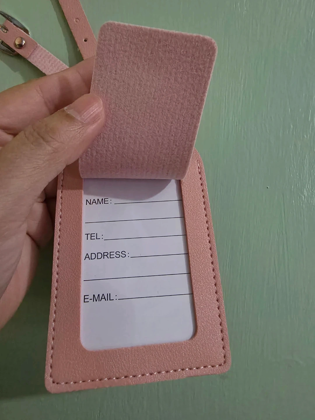 This light pink luggage tag is made of faux leather and features a flap to write your contact information. Comes with faux leather strap and buckle to secure onto luggage. It's perfect for identifying your bags on your next trip!