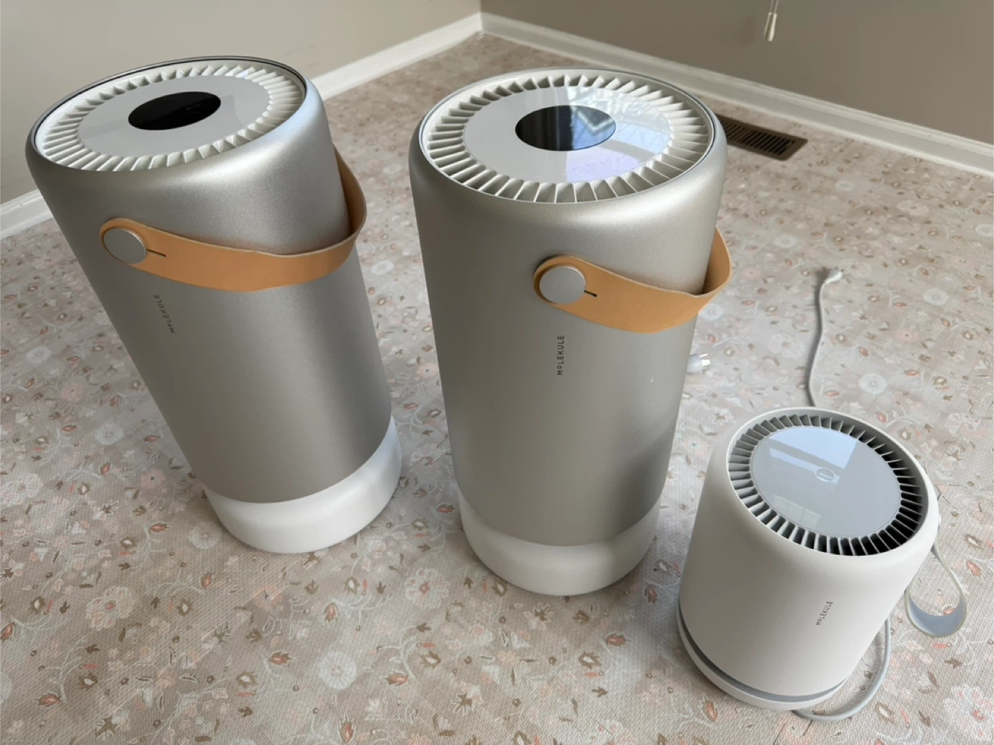 This set includes two large and one small Molekule air purifiers. They're silver and white with a tan leather handle. The large units have digital displays showing air quality status.