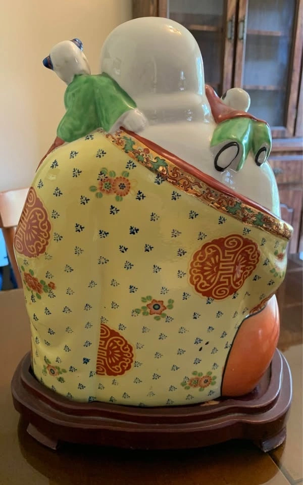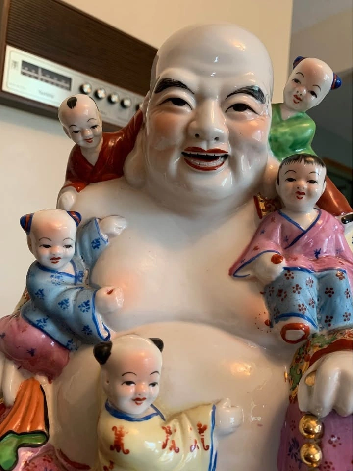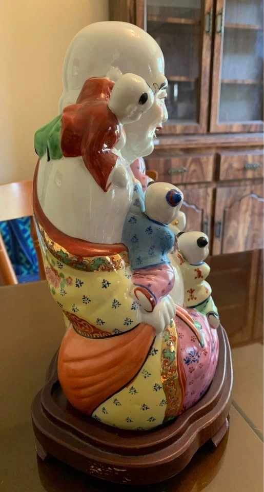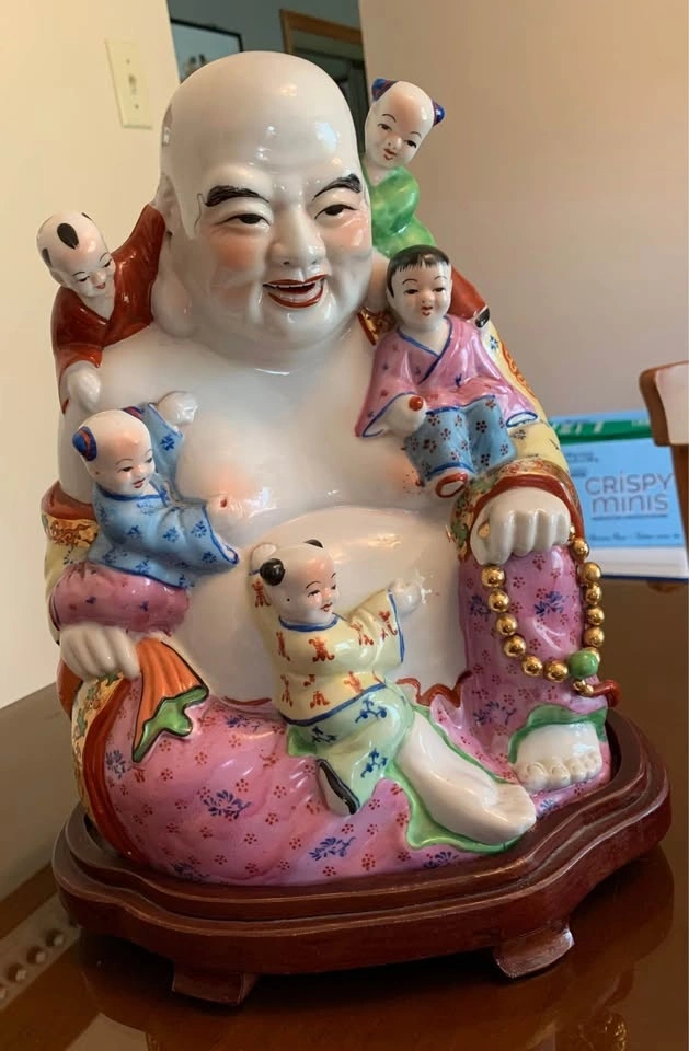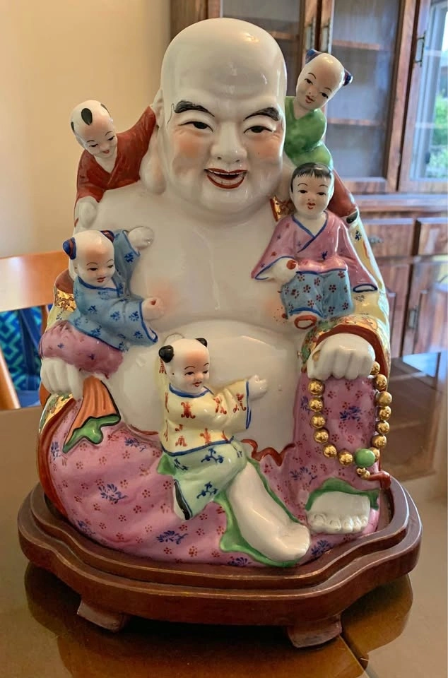 Porcelain laughing Buddha with 5 Children figurine. It represents fertility, harmony, and the wish for many children and grandchildren. The five children clinging to or playing with the Buddha are often interpreted as representing the five elements (earth, fire, water, wood, and metal) and their balance in the home. The statue is also seen as a symbol of happiness, joy, and the banishment of negative energies. Comes with stand. Approximate measurements 12"Hx9"W.(with stand 13.5"H).