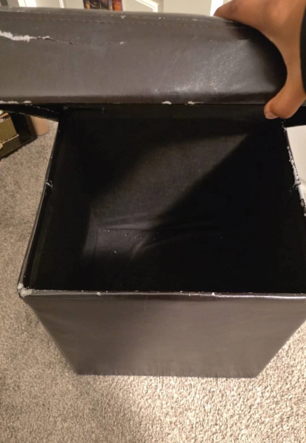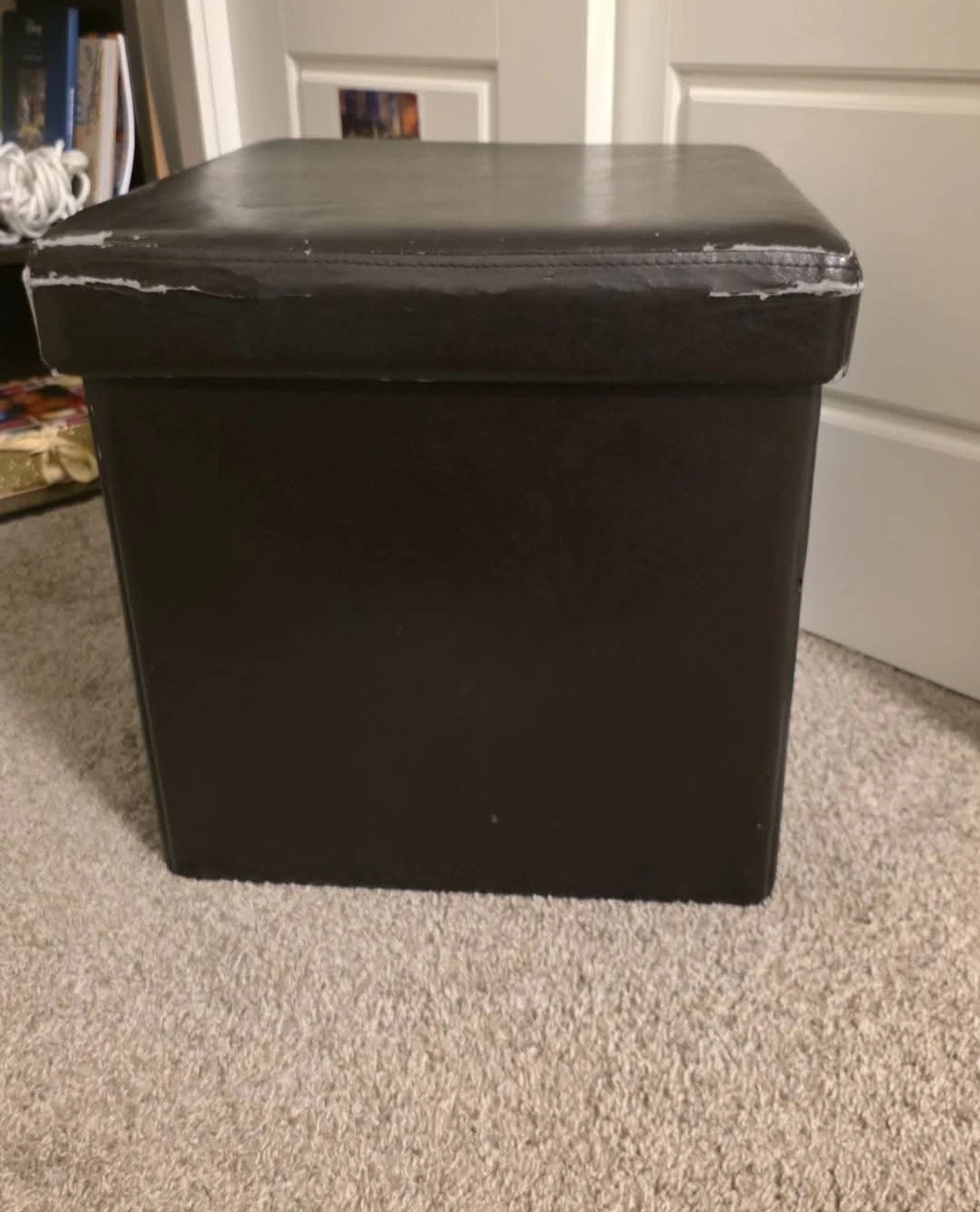 A dark brown storage ottoman that opens up for storage. It's made of faux leather. It can be used for extra seating or to keep items tucked away. - i will gift on my buy nothing group first and here second. Pick up Pipeline road.