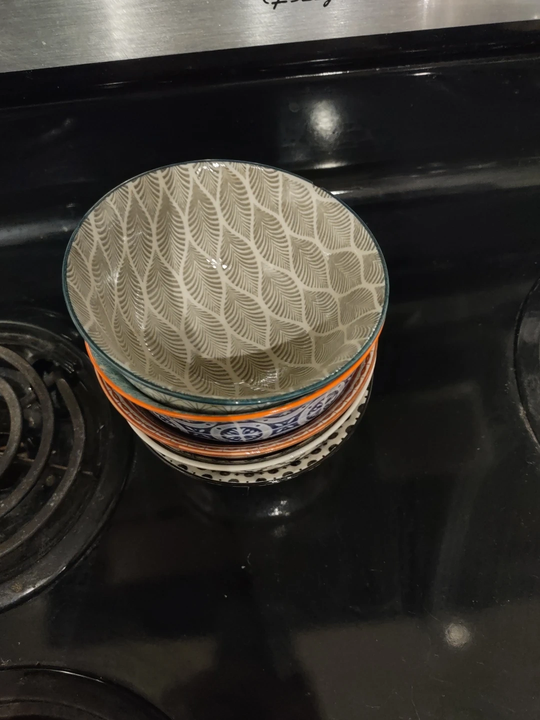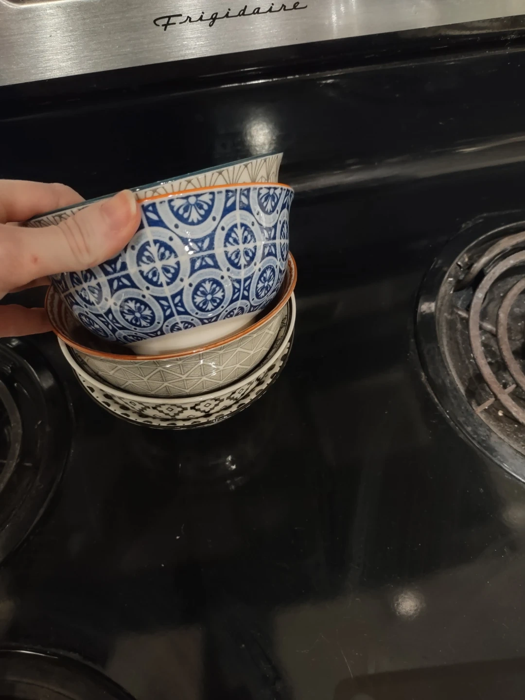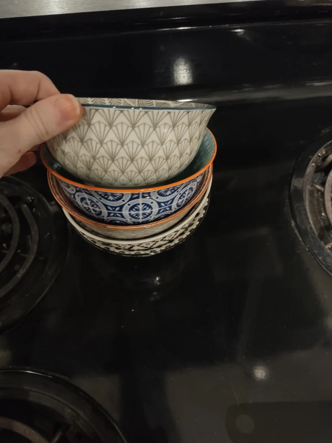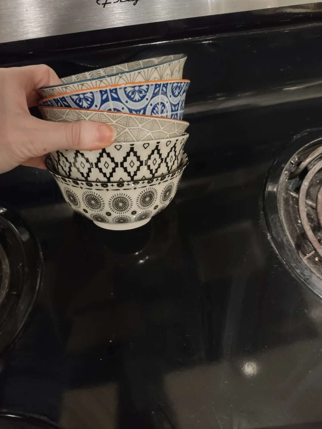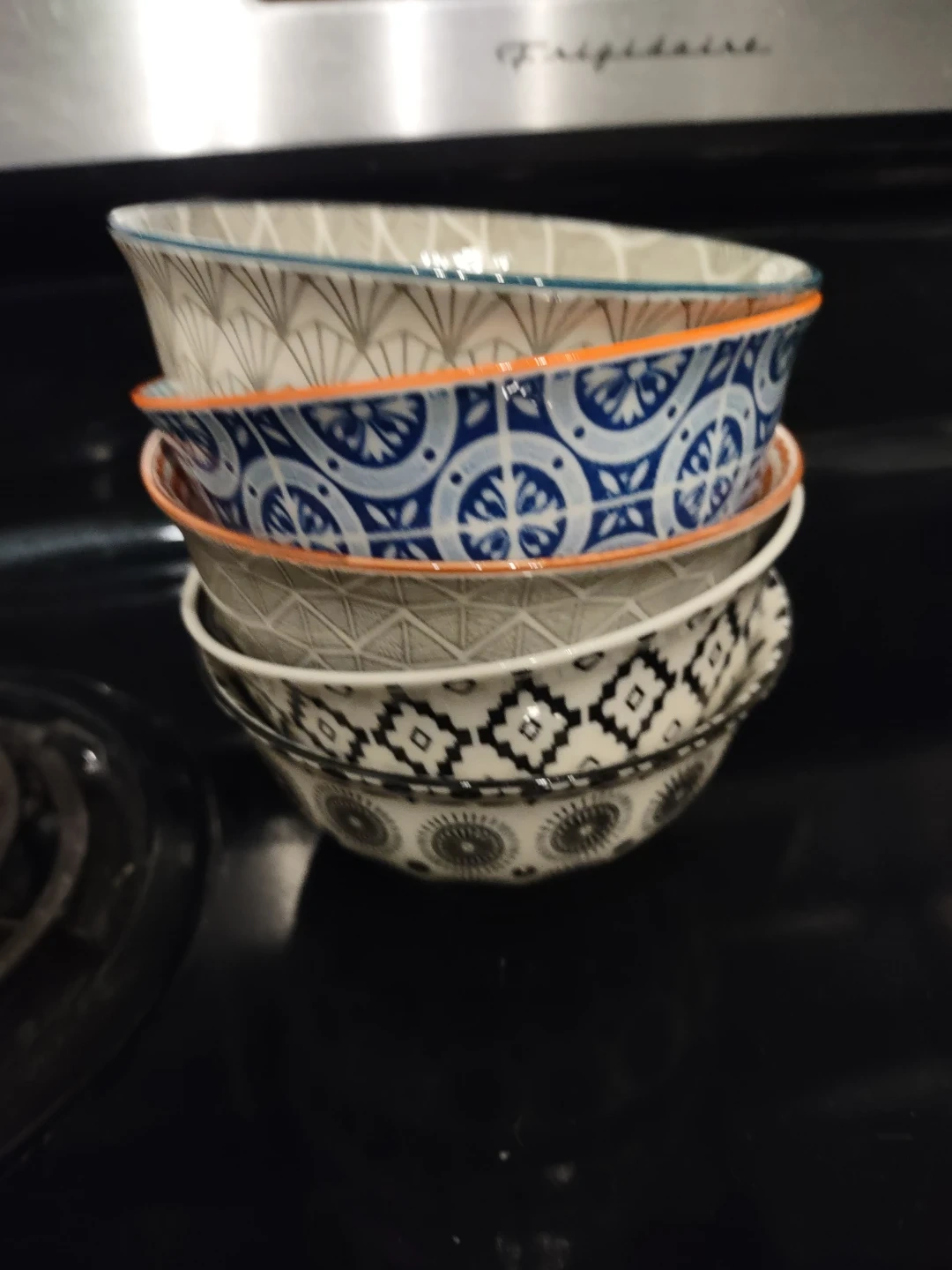 Four decorative ceramic bowls with unique patterns. They're perfect for serving snacks or as accent pieces. Each bowl features a distinct design, including geometric and floral motifs.