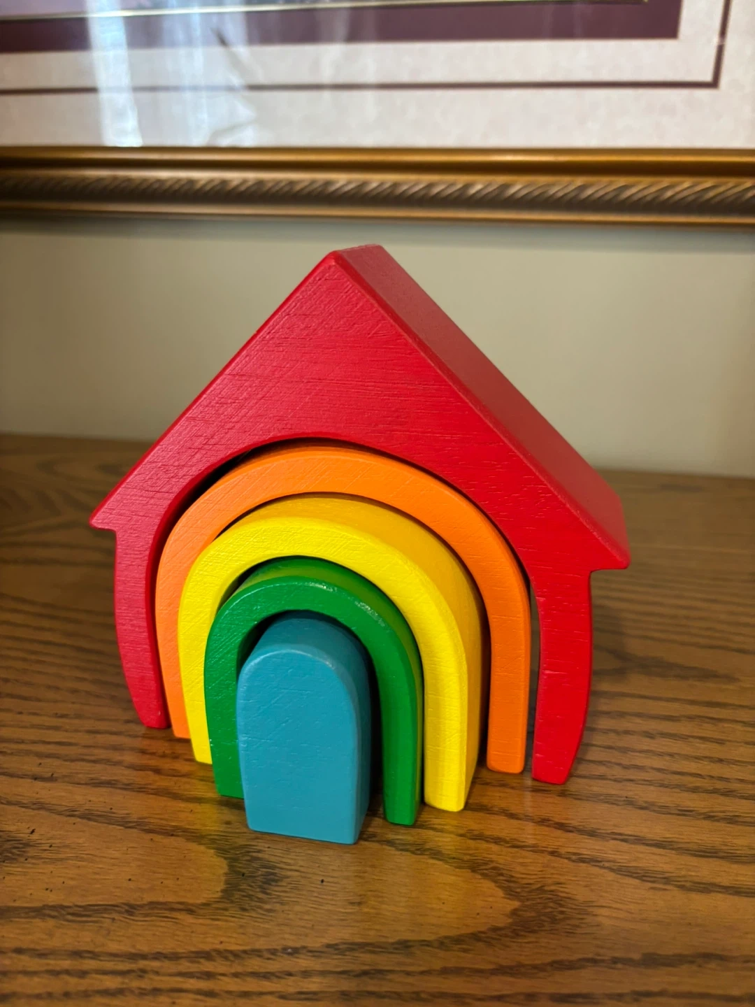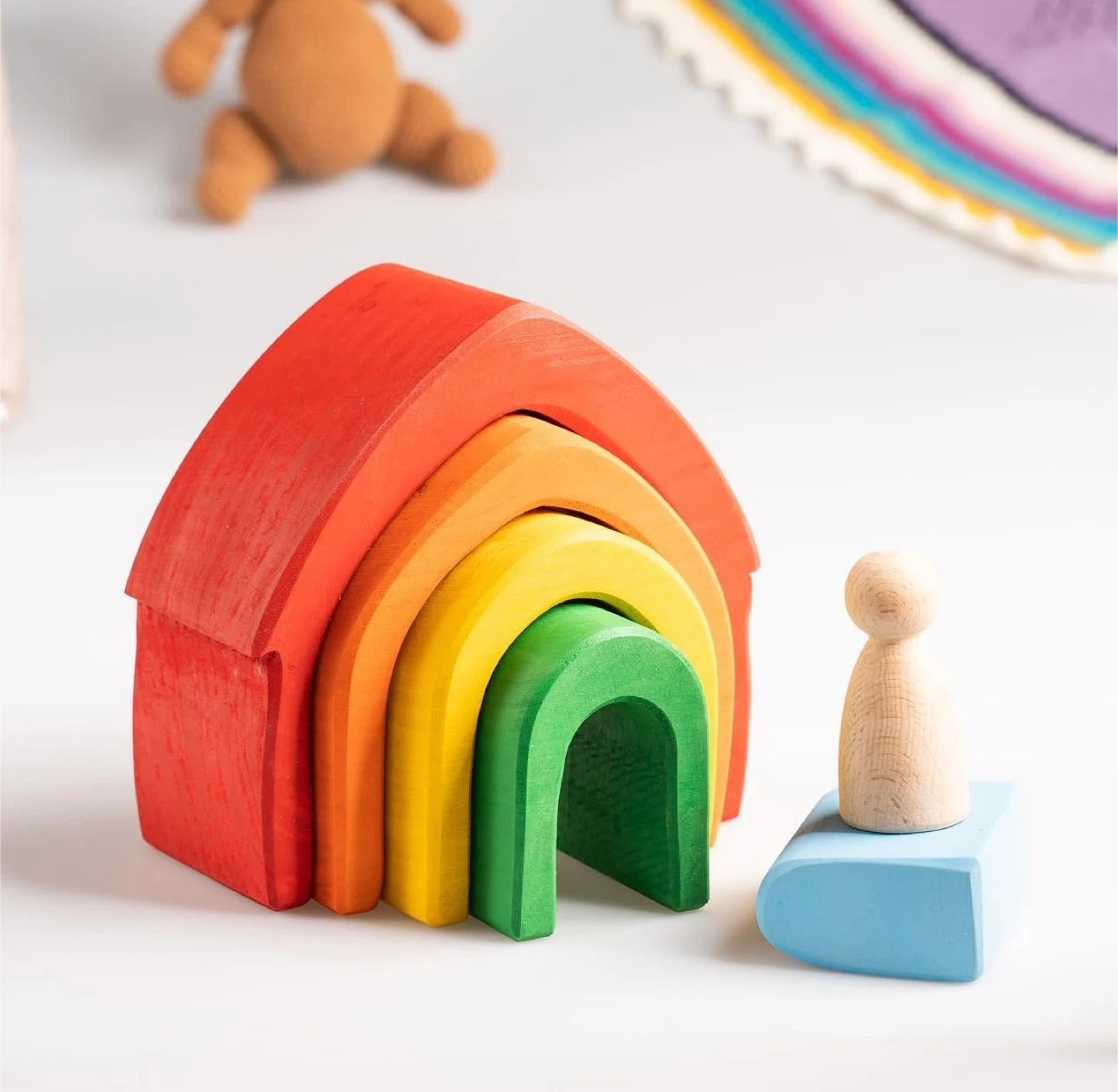 Beautiful wooden rainbow house stacking toy with bright, cheerful colors. Made from solid wood with smooth, rounded edges β perfect for little hands and open-ended play.