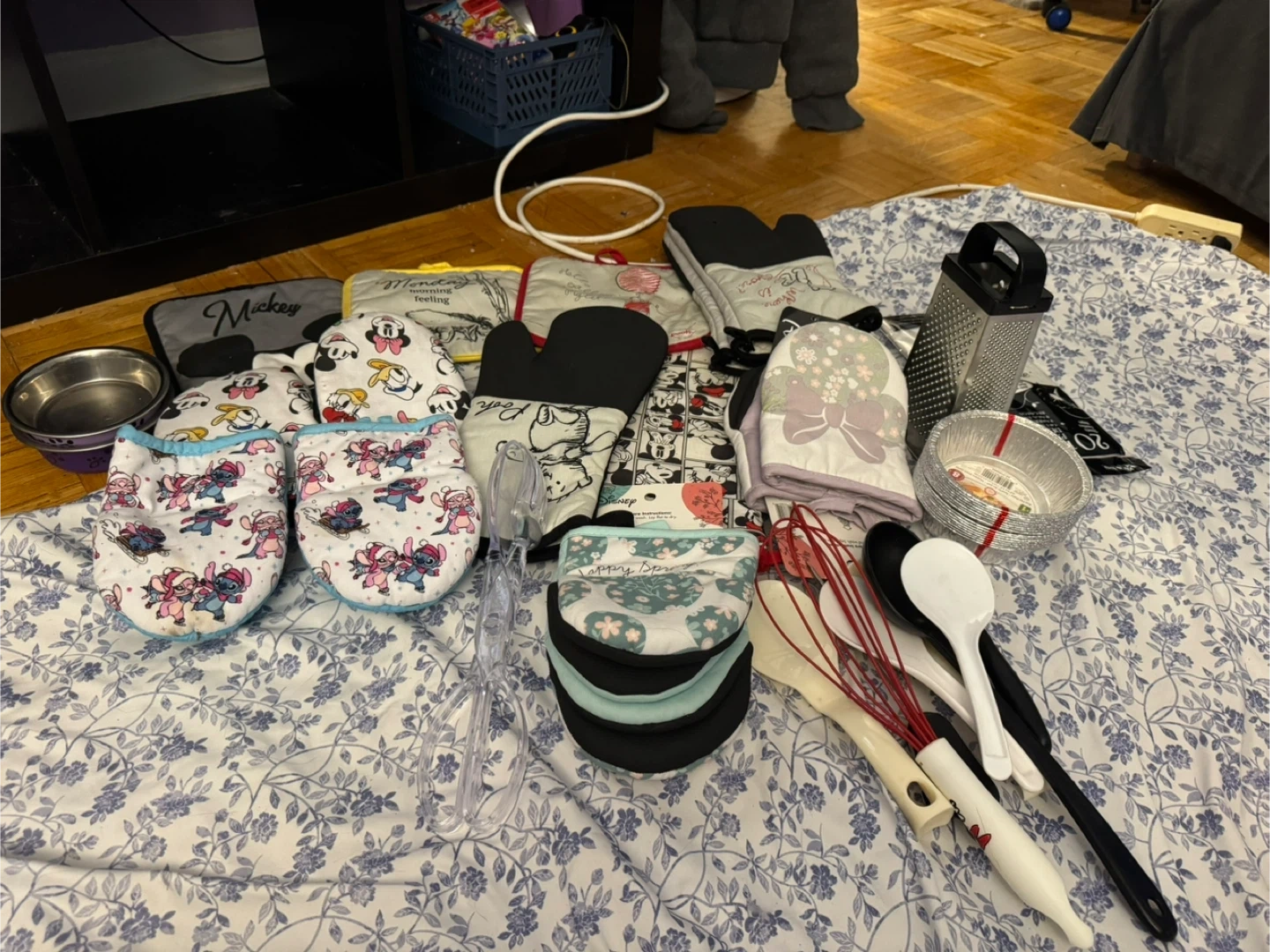 Free! Assortment of kitchen mitts featuring Mickey Mouse and Stitch designs. Includes oven mitts, pot holders, and a set of baking tools like whisks and spoons. Also contains a grater and foil baking cups.