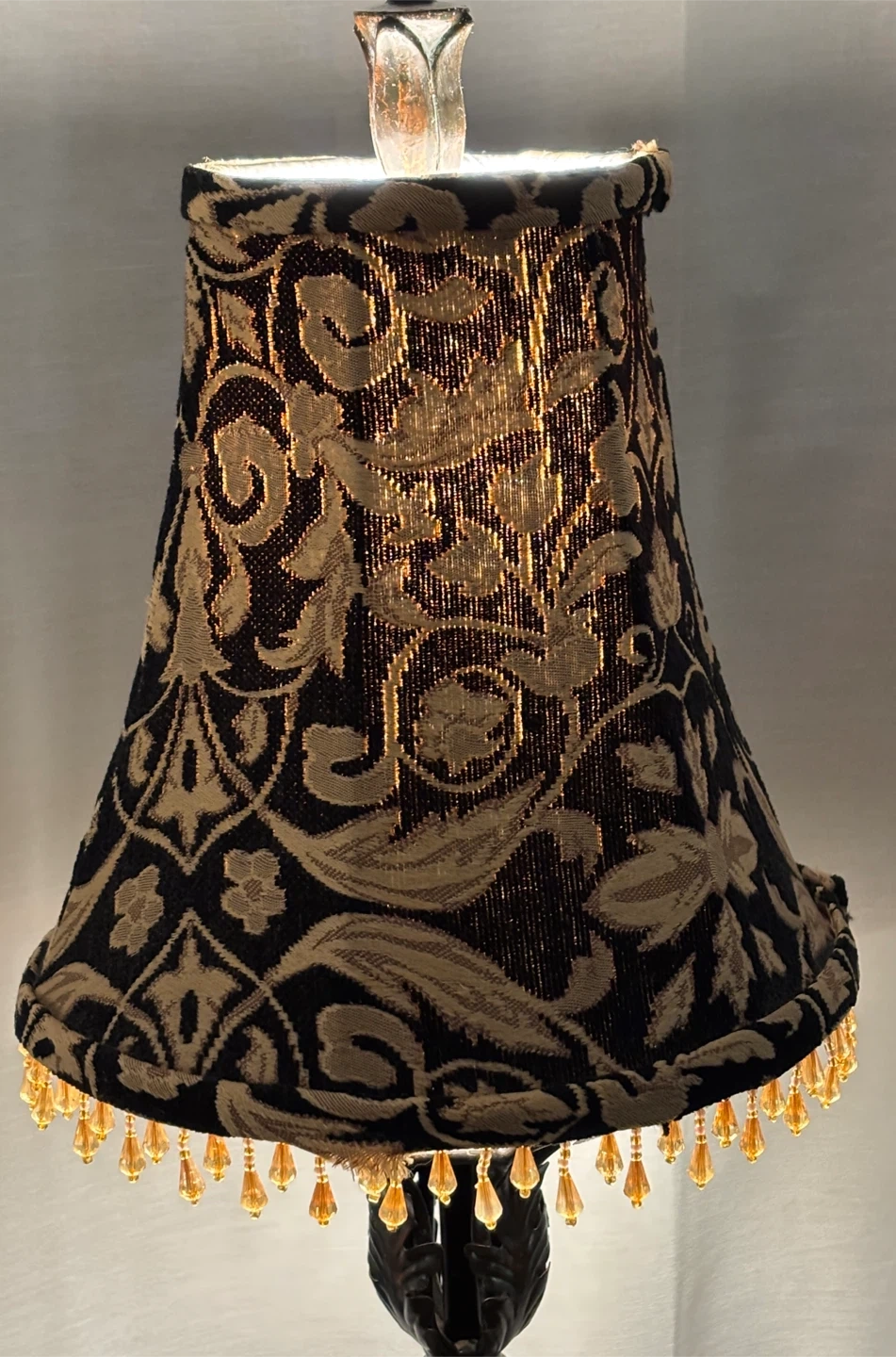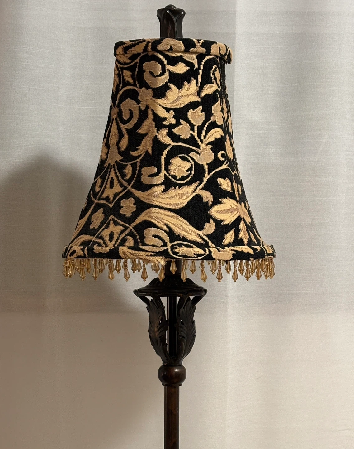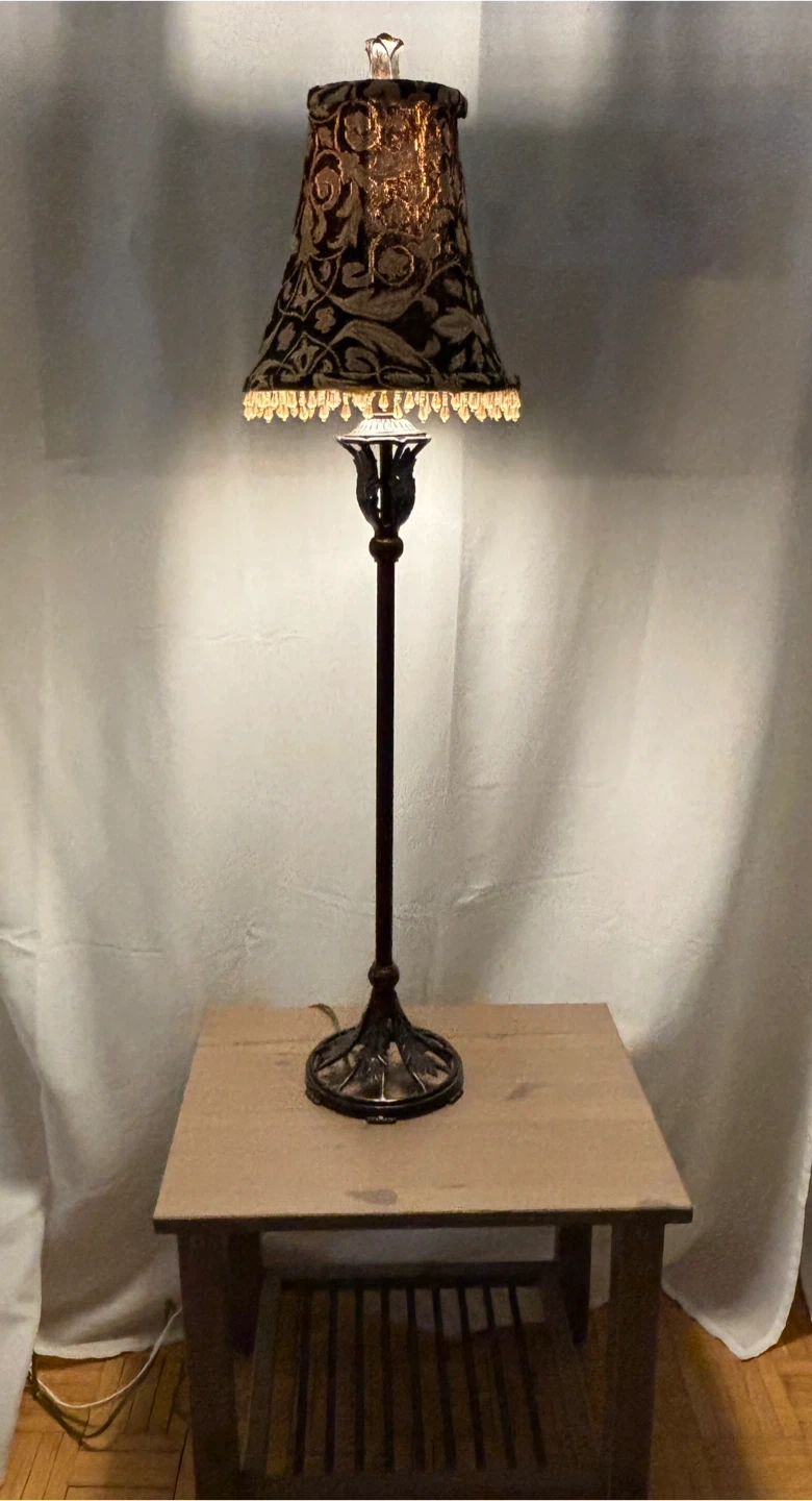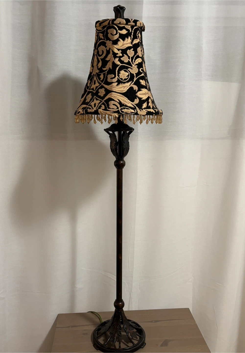 Table lamp with decorative fabric lampshade.It has a dark metal base with leaf accents and is adorned with a beaded fringe along the bottom edge of the shade.Height 39 inches (100 cm).