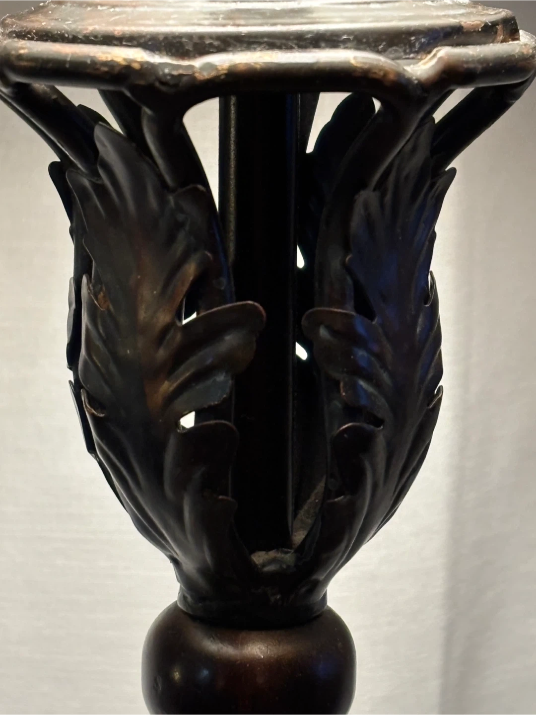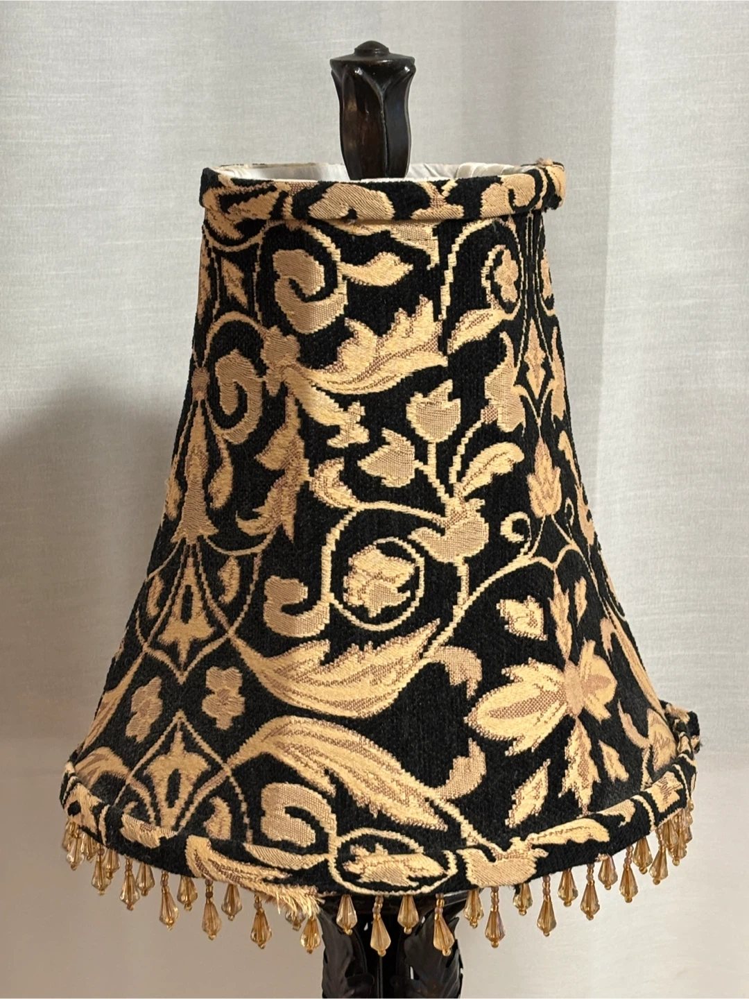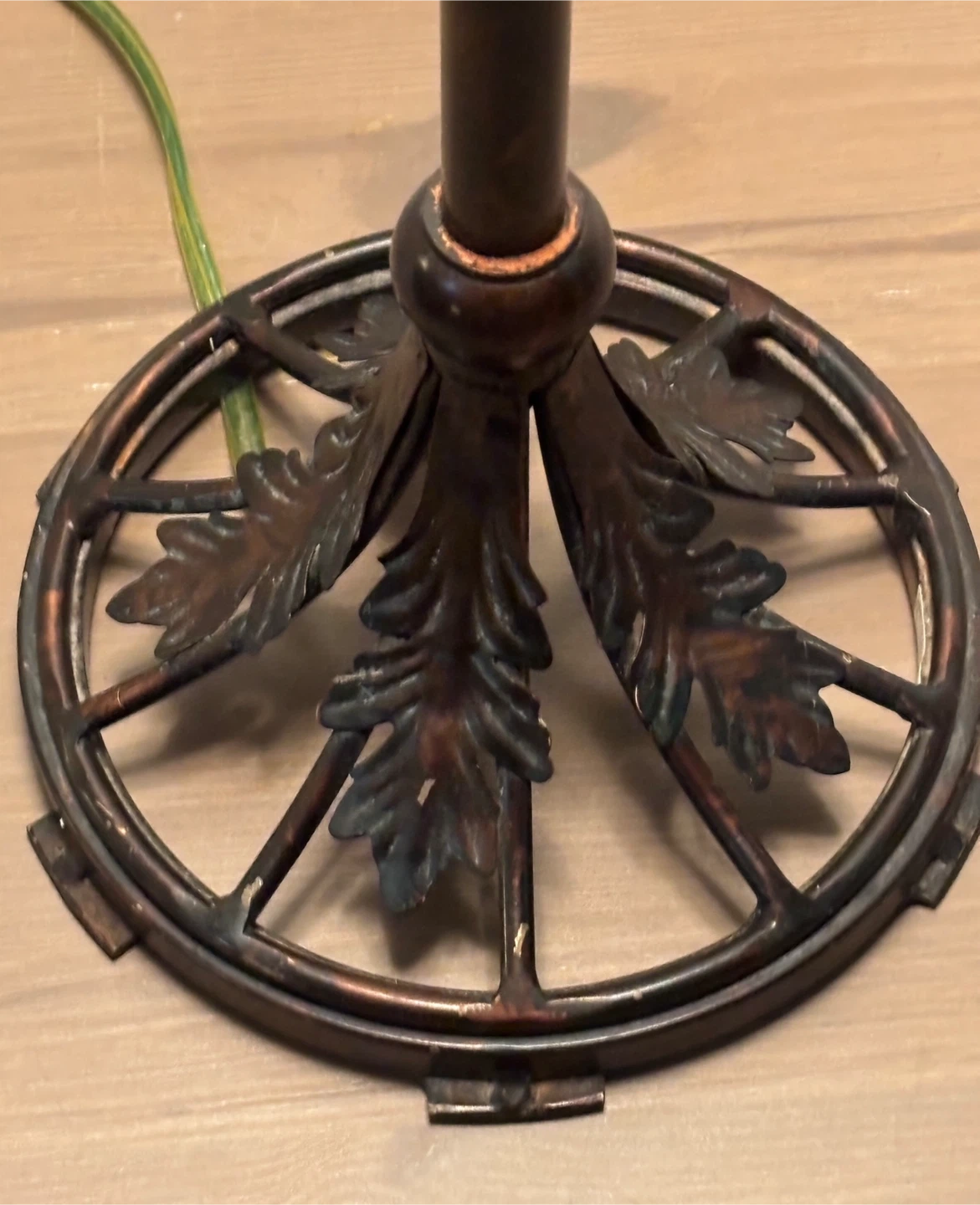 Table lamp with decorative fabric lampshade.It has a dark metal base with leaf accents and is adorned with a beaded fringe along the bottom edge of the shade.Height 39 inches (100 cm).