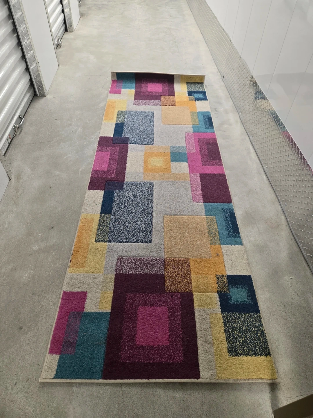 This accent rug features a vibrant geometric pattern with squares and rectangles in shades of pink, blue, yellow, and gray. It's a great way to add a pop of color to any room
