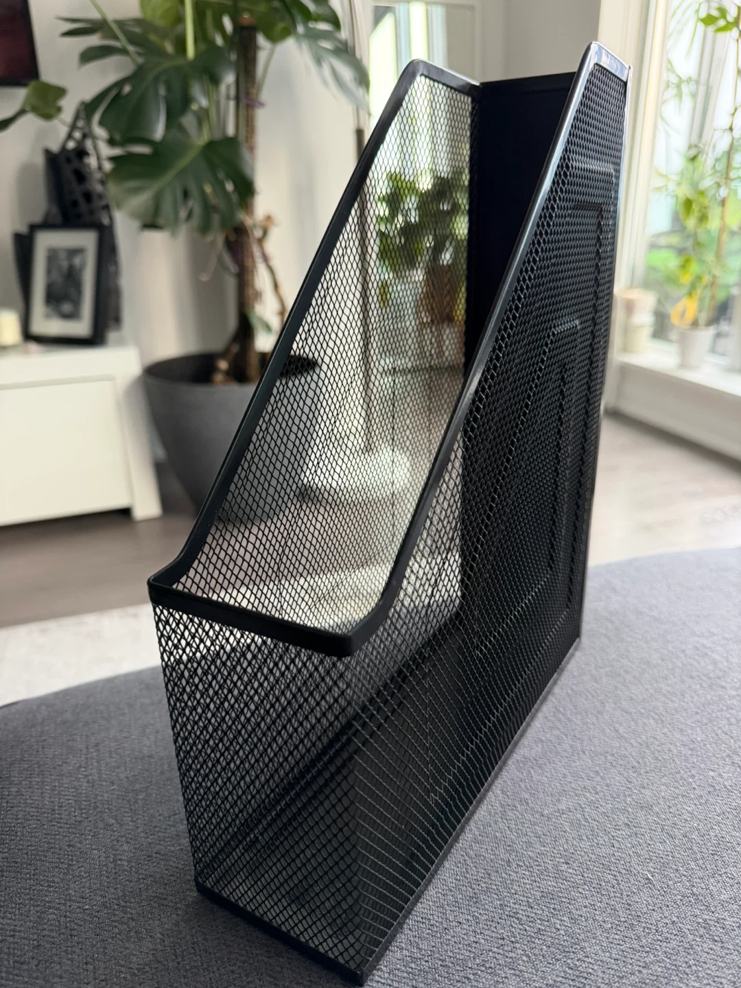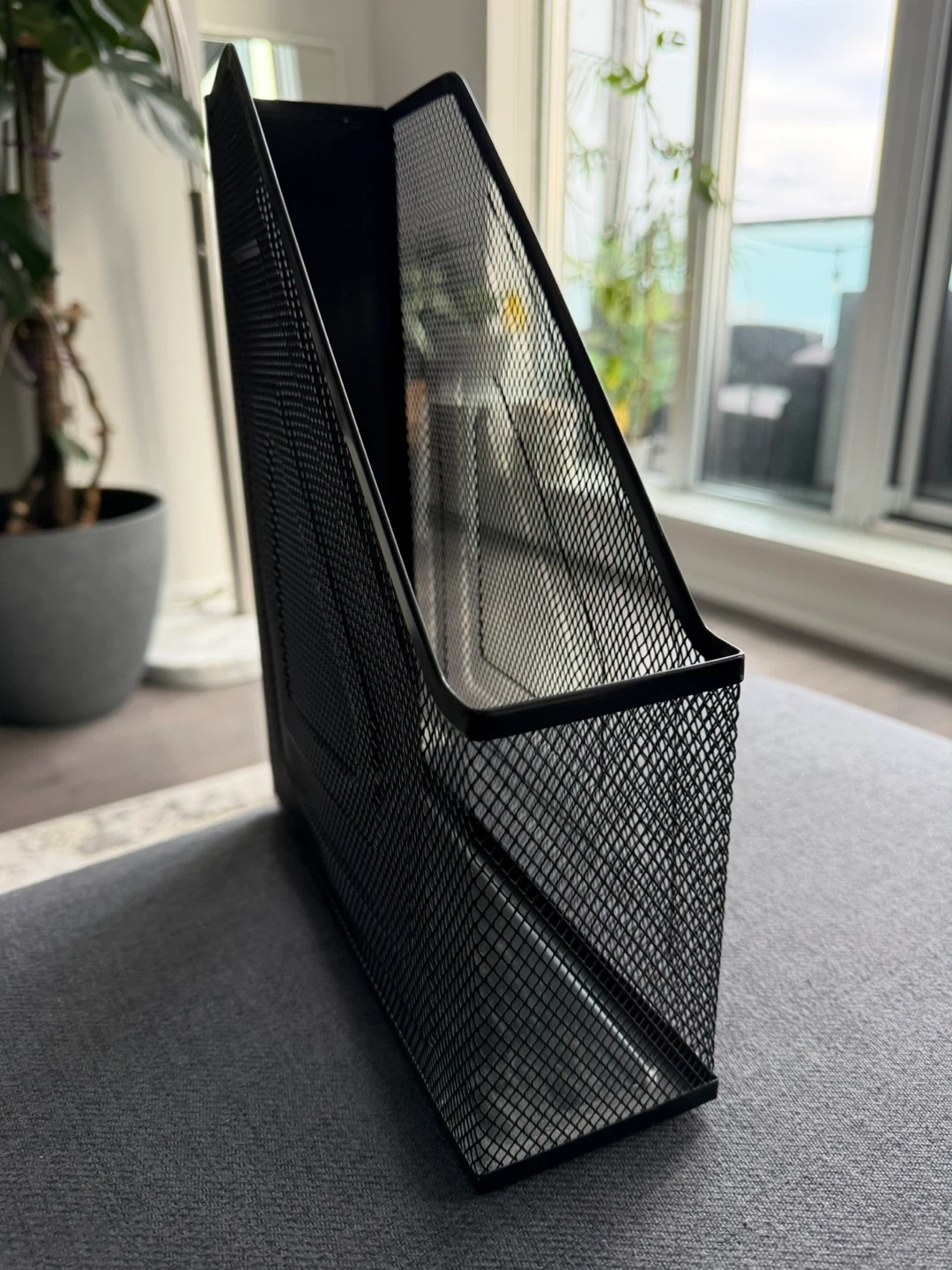 Here's a handy black mesh file organizer! It's perfect for keeping your documents and papers tidy on your desk or shelf. It's in great shape and ready to help you get organized