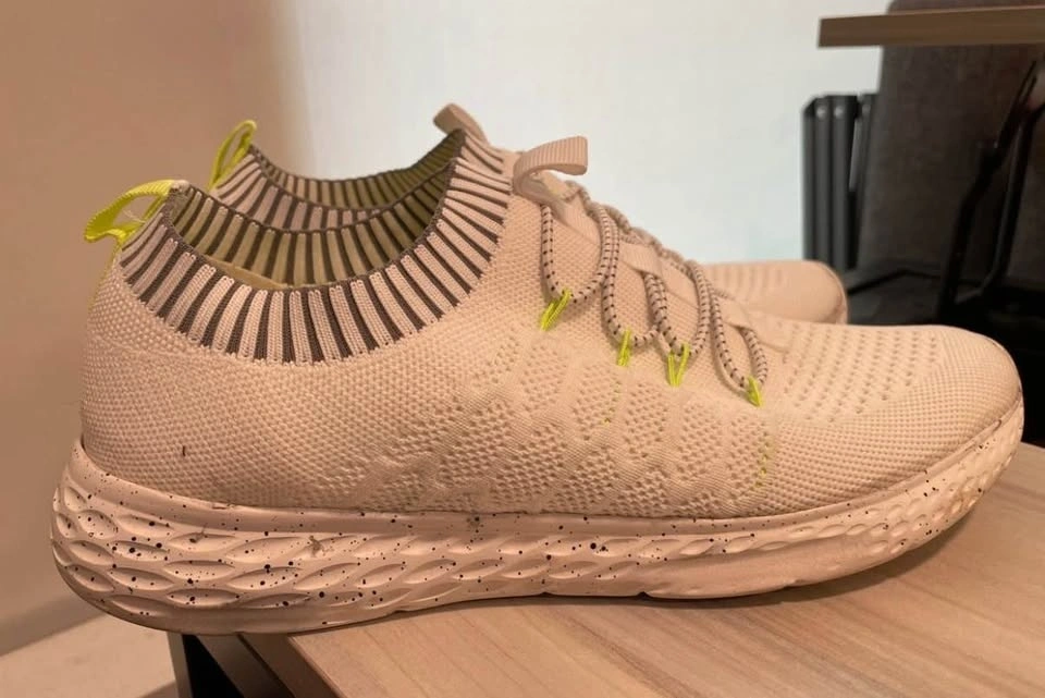 Comfy white knit sneakers with cool neon yellow accents on the laces and heel tab. Speckled soles. Easy to slip on.