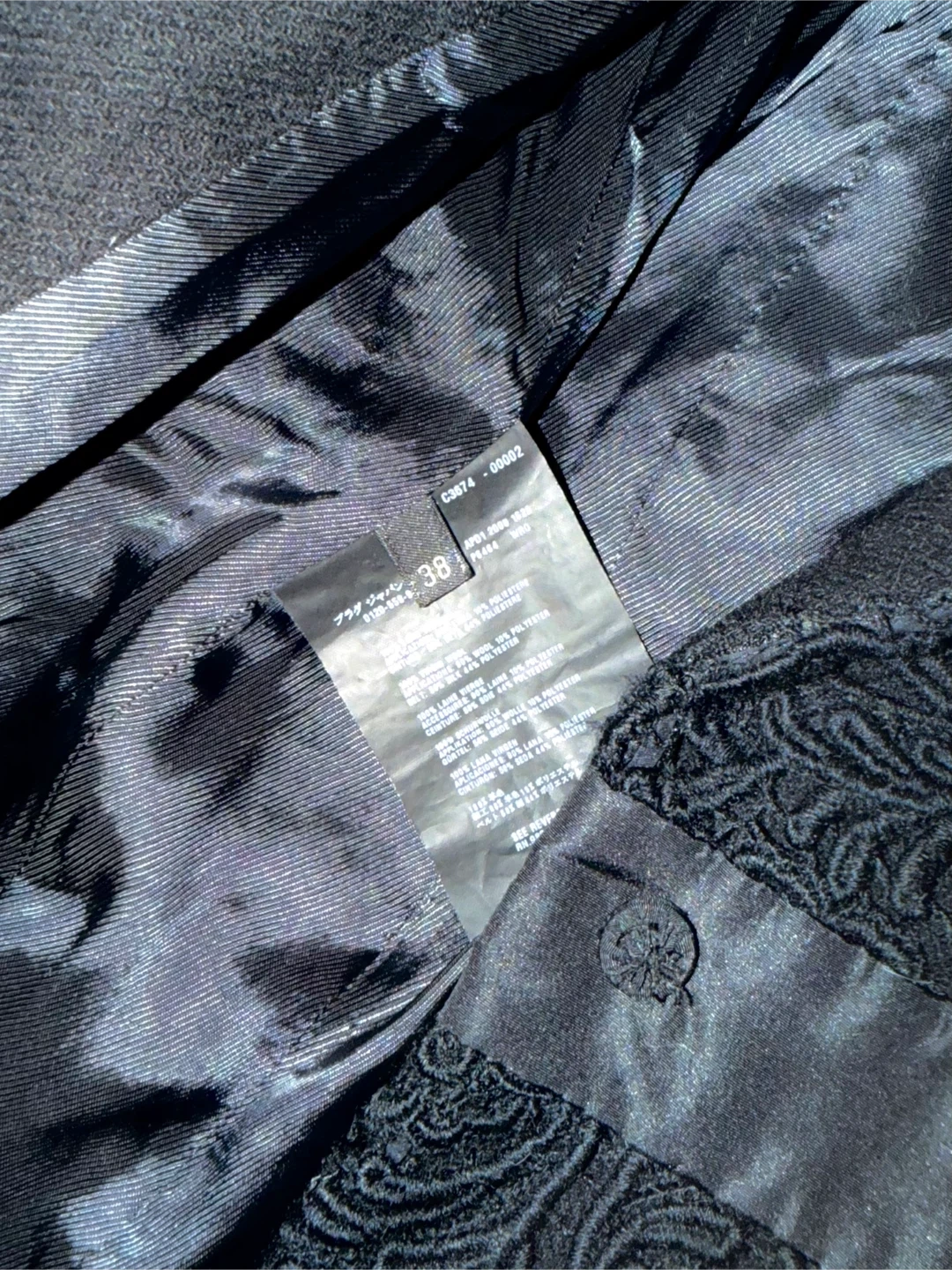 Fabric: 100% Virgin Wool; Trim 90% Wool, 10% Polyester; Combo 56% Silk, 44% Polyester.