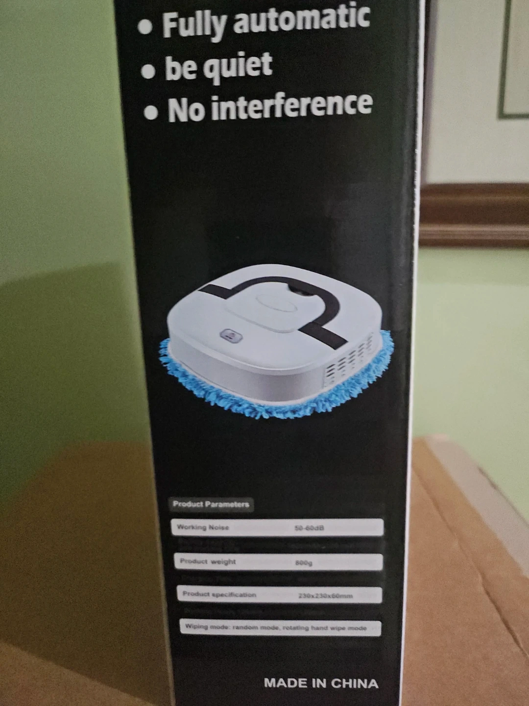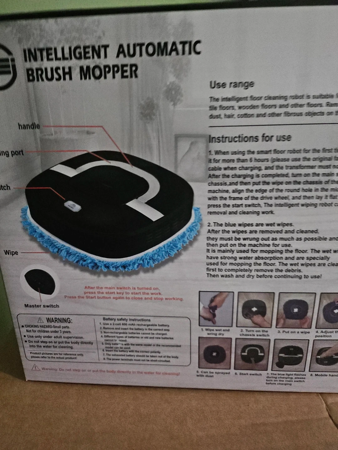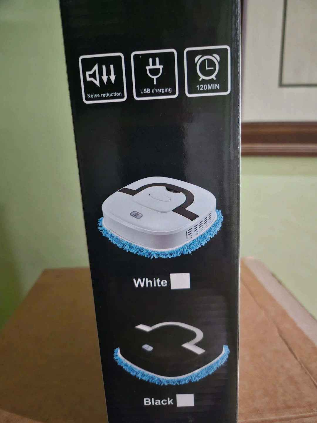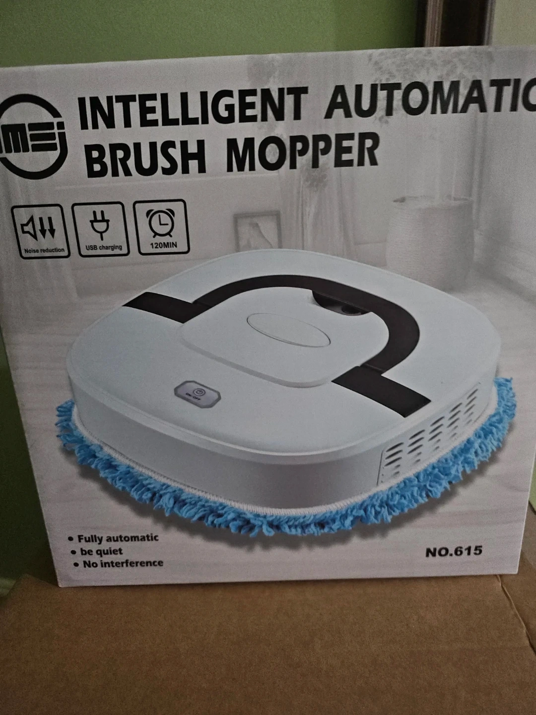This is an intelligent automatic brush mopper with USB charging. It has a 120-minute working time. The product specification is 230x230x60mm and it weighs 800g.