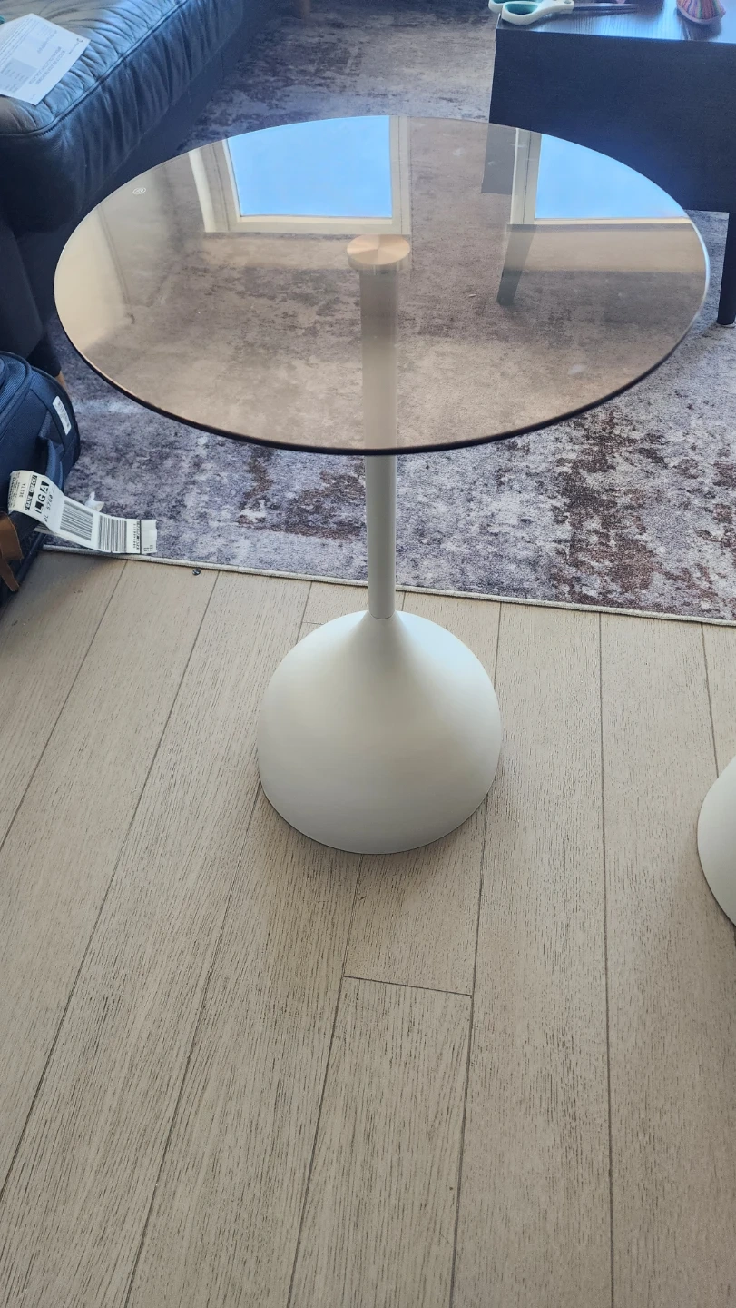 Round glass top side tables with an off white pedestal base. They are a stylish accent piece for any room. Glass top is amber tinted and the base has a matte finish. $55 for both or $29 individually