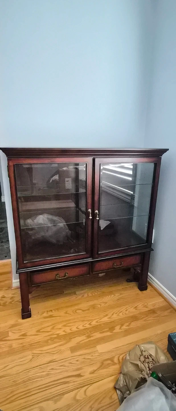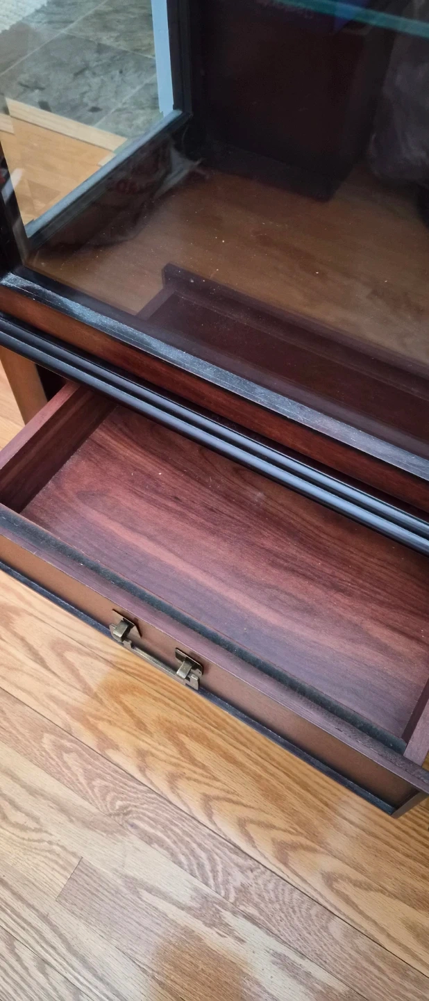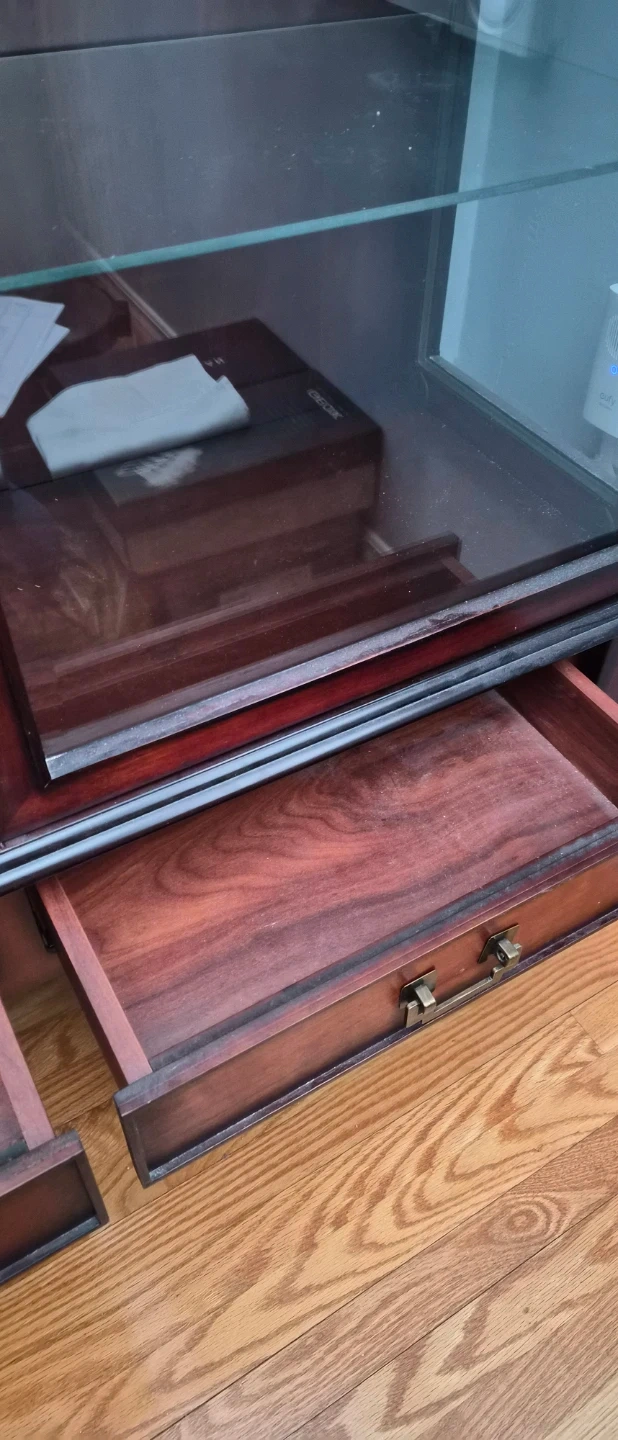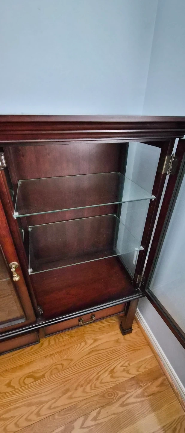 This beautiful china cabinet features a rich wood finish with glass-front doors and two drawers for extra storage. It includes three adjustable glass shelves inside for displaying your favourite items. It's a lovely piece for any dining room or living space!