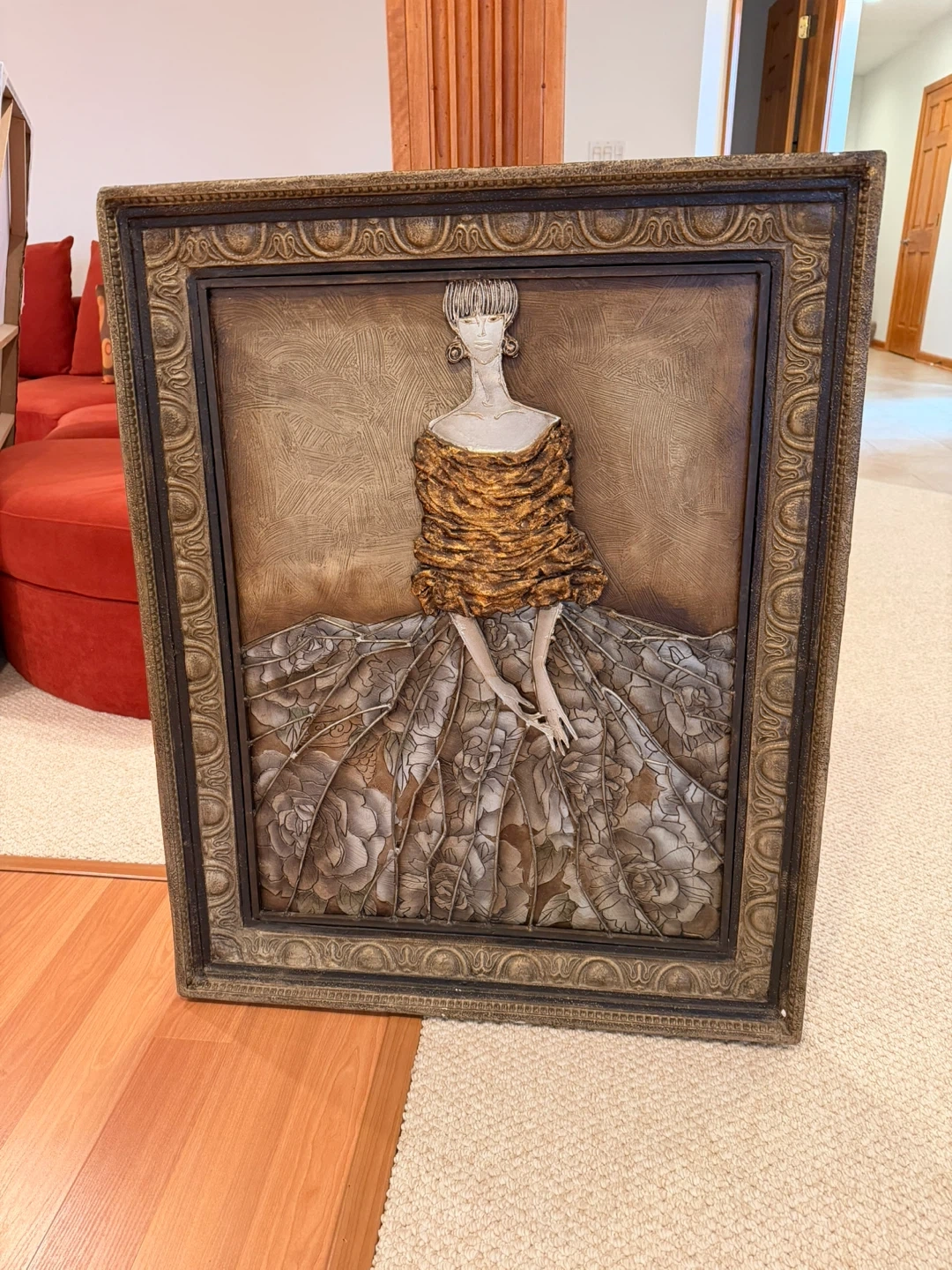 This framed wall art depicts a woman in an ornate gown. The artwork features raised textures and a detailed floral pattern on the skirt. It's housed in a decorative, antique-style frame.