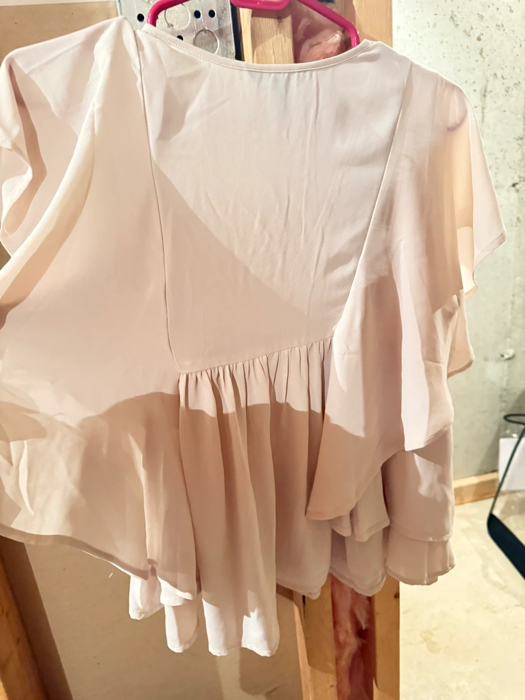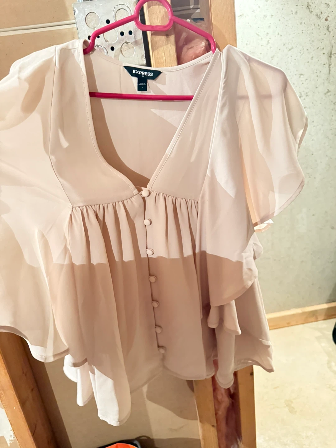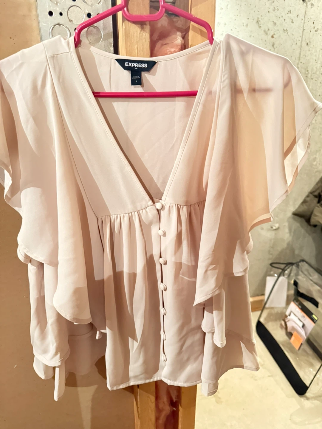 This Express women's blouse is a light pink color and size 4. It features a V-neckline with button detailing and ruffled sleeves. The fabric is lightweight and flowy. Perfect for a dressy casual occasion!