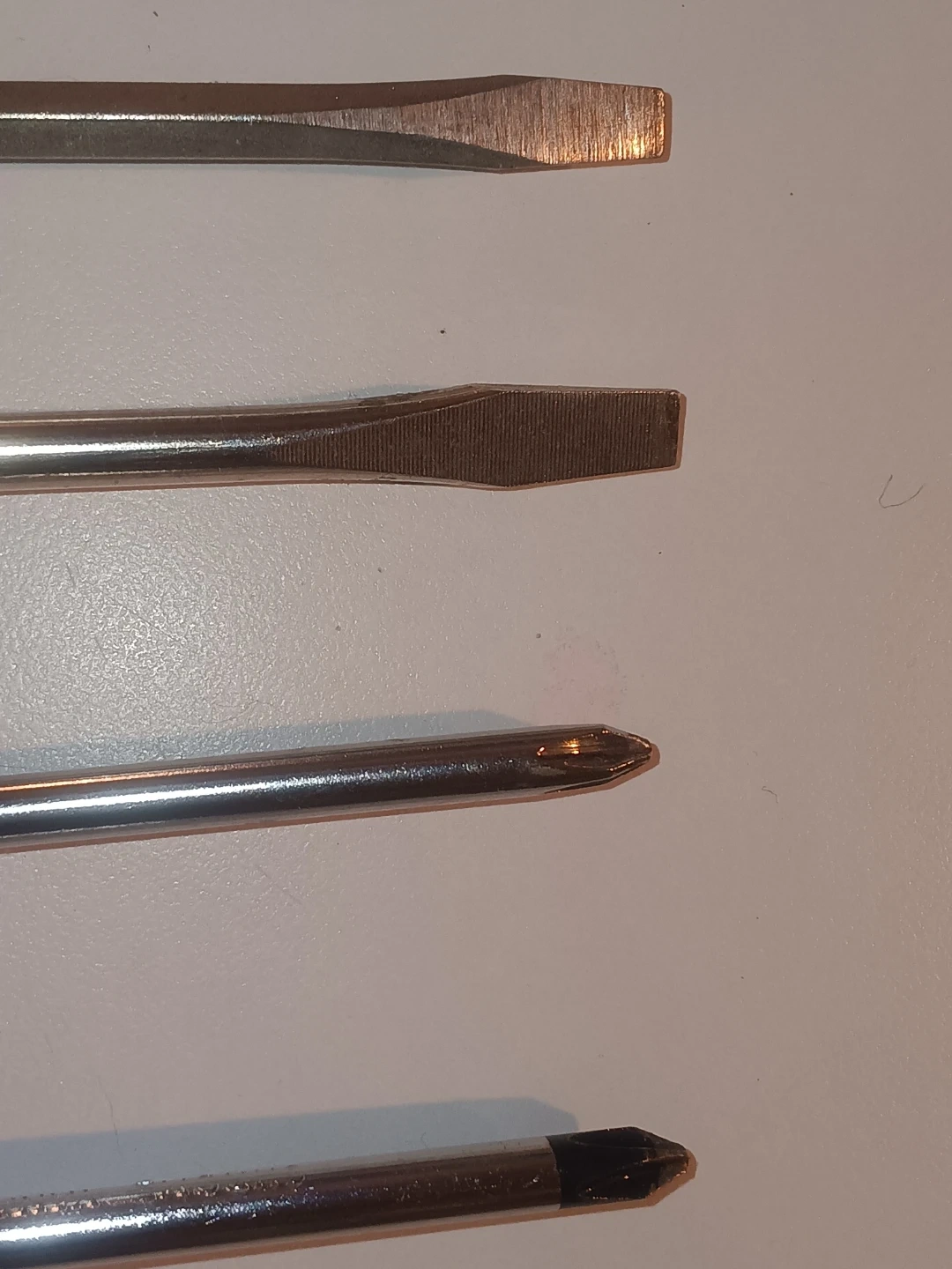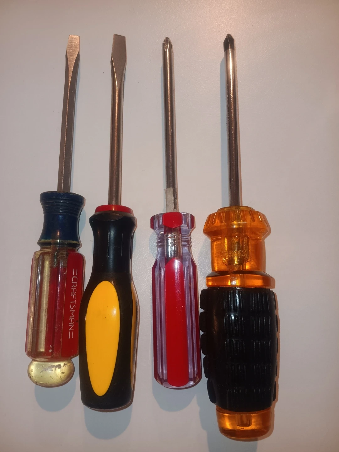 This set includes four screwdrivers with assorted tip types. Metal shafts and durable handles. One screwdriver is a Craftsman brand.
