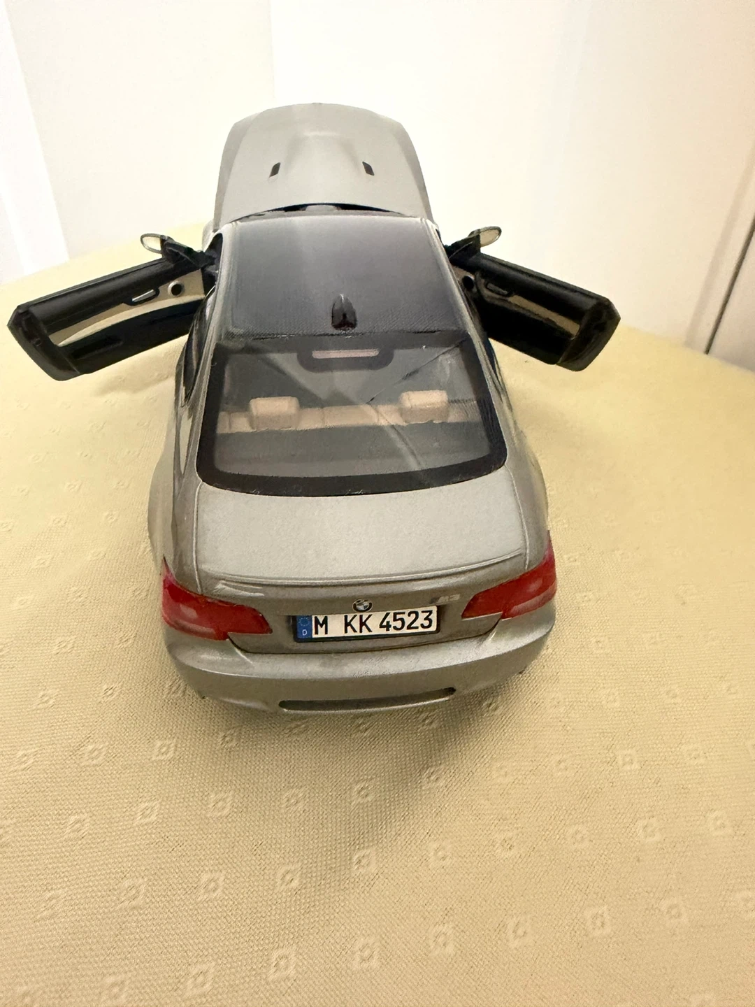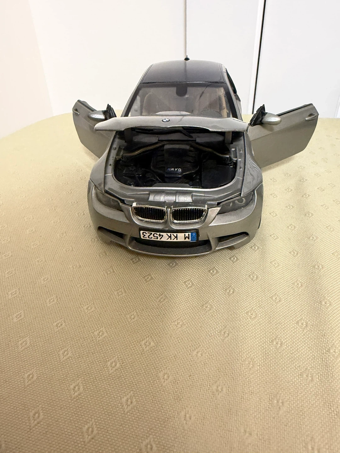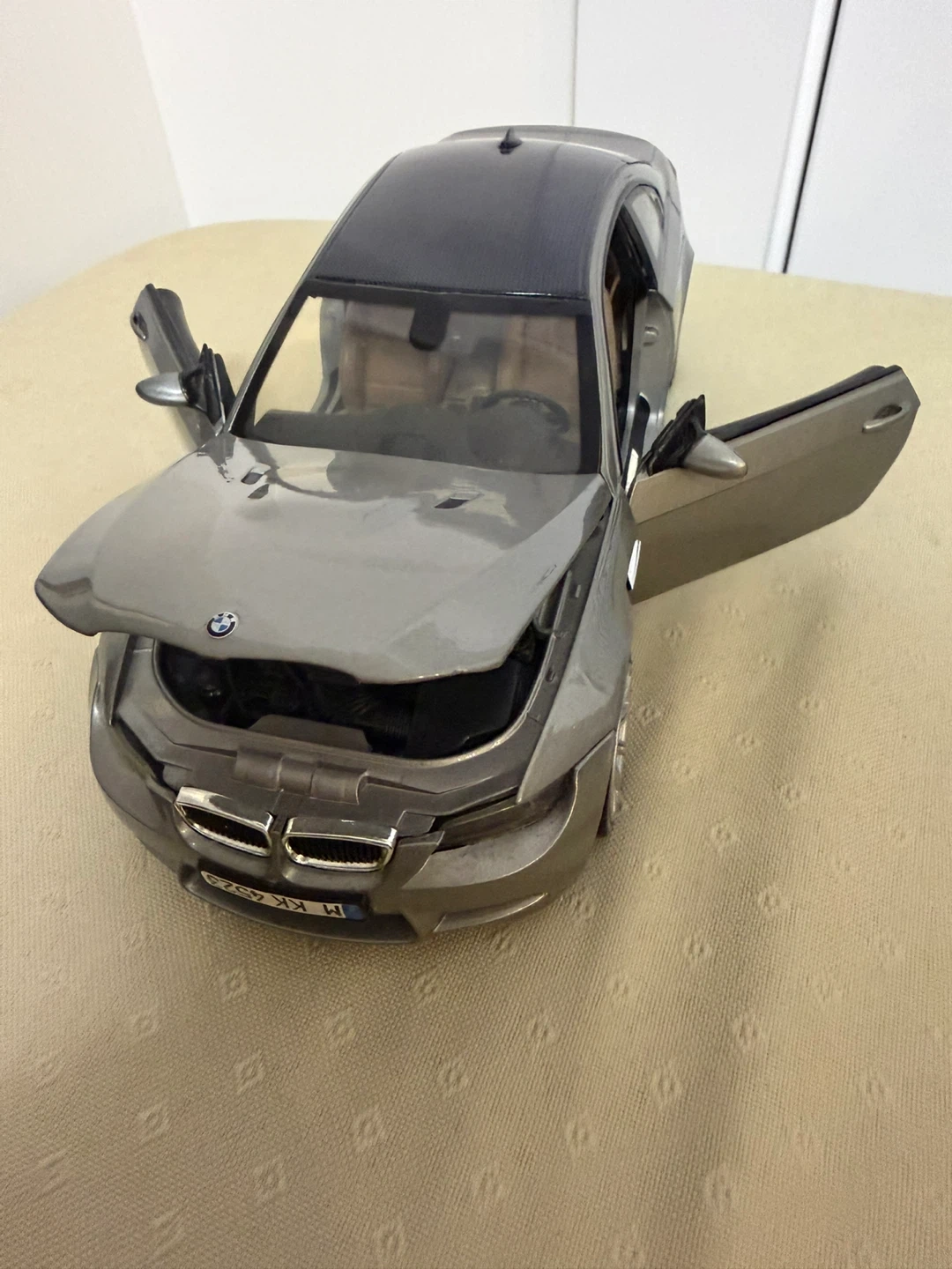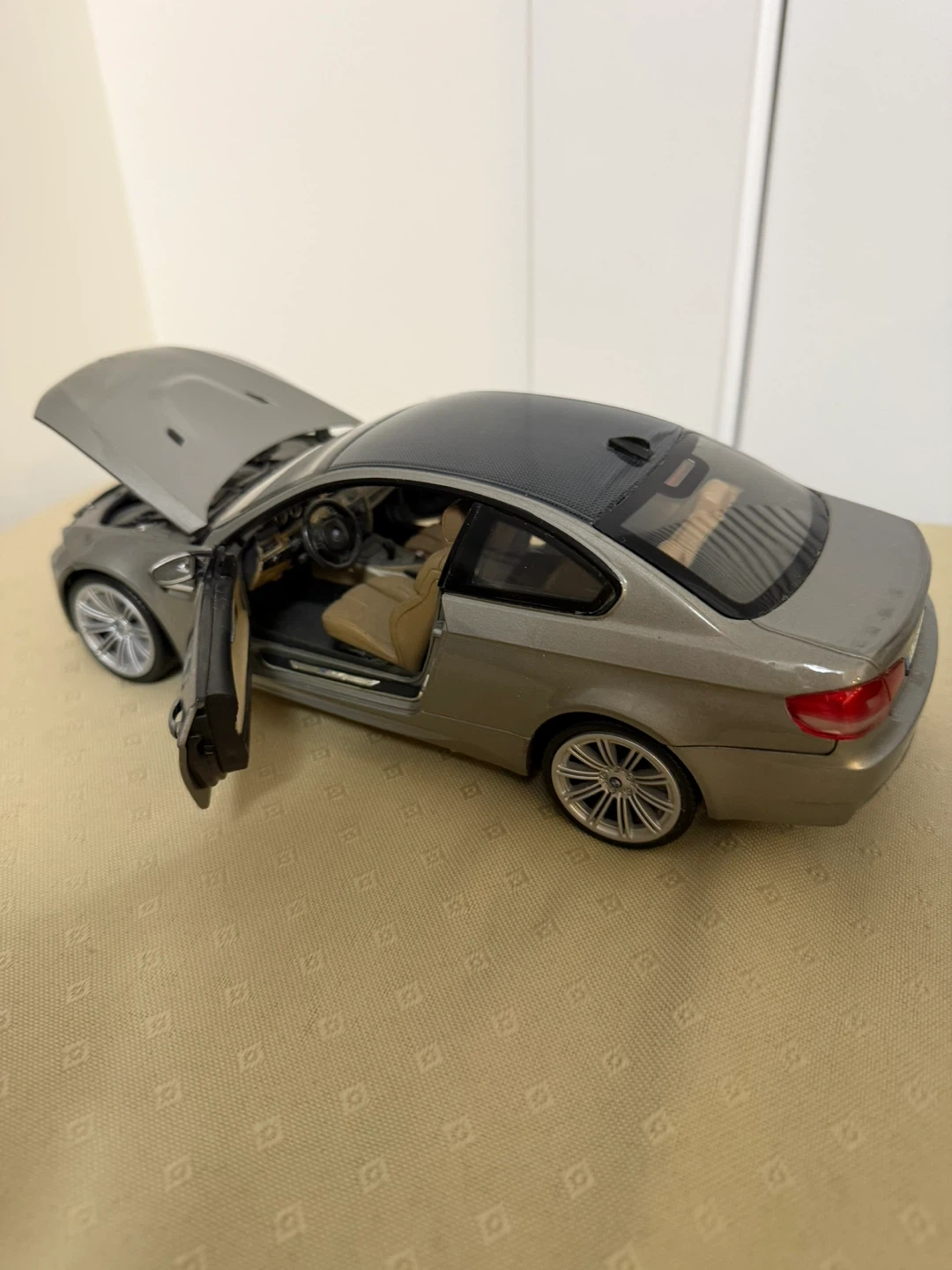This is a detailed diecast model of a BMW M series car. It features opening doors, hood, and trunk. The interior is intricately designed with realistic seats and dashboard.