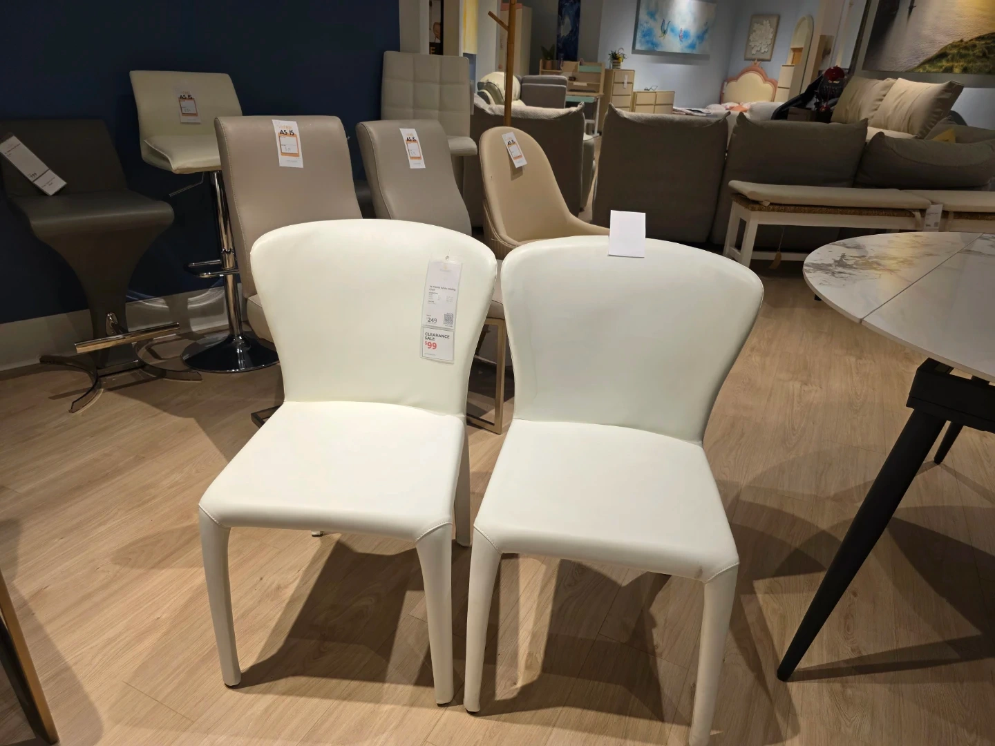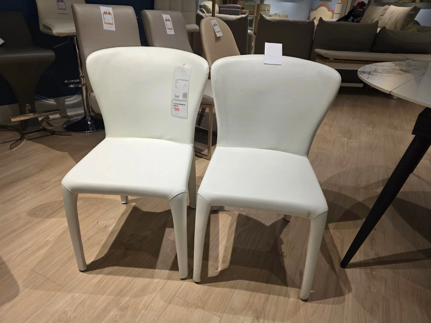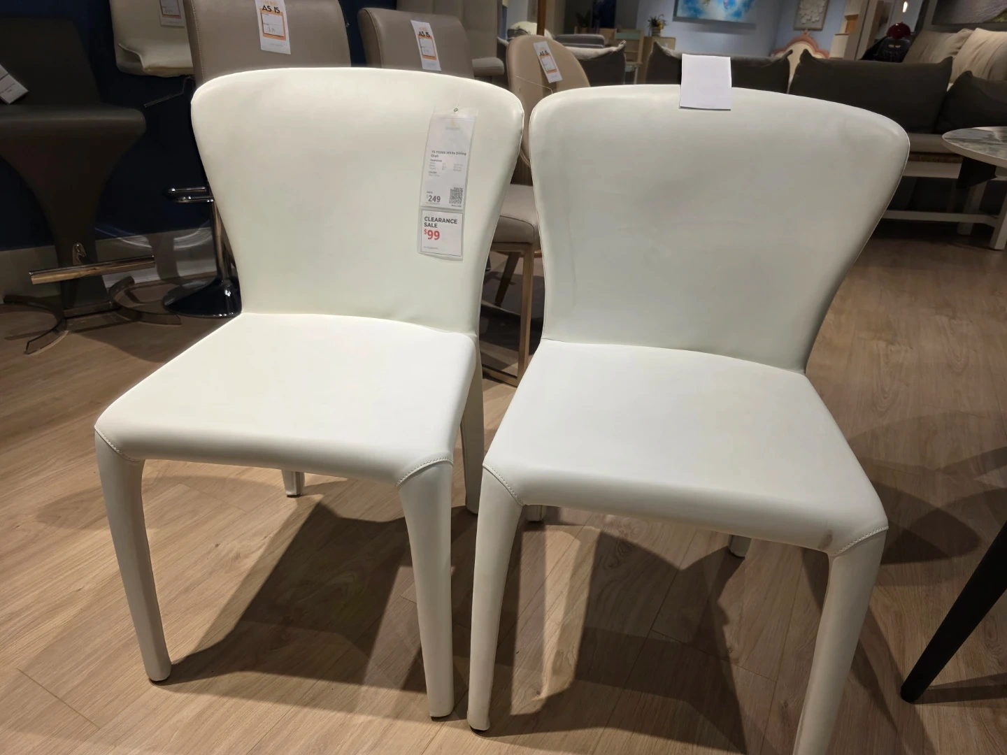 Two white dining chairs with a modern design. These chairs feature a sleek, contoured backrest and are upholstered in a durable material. They're perfect for adding a touch of style to any dining space. Brand new.