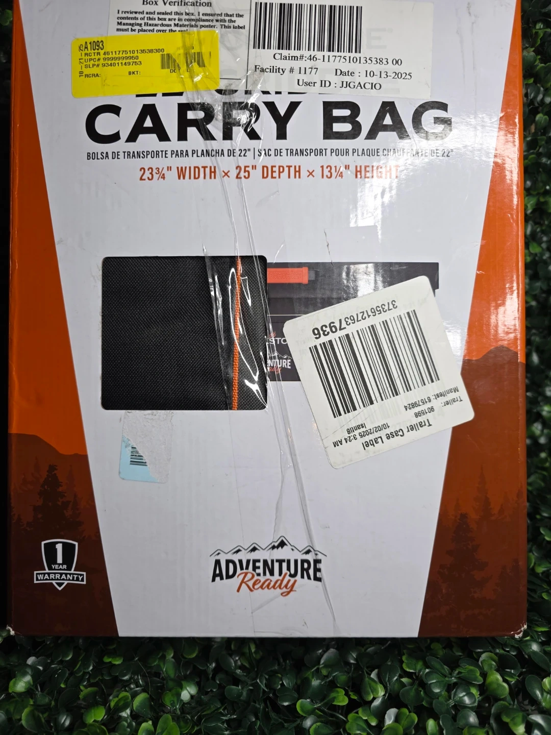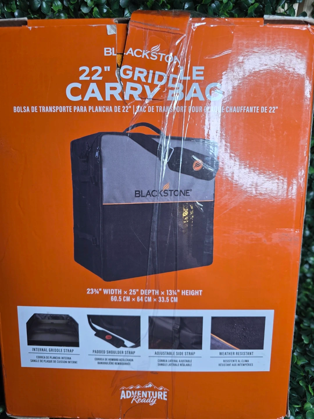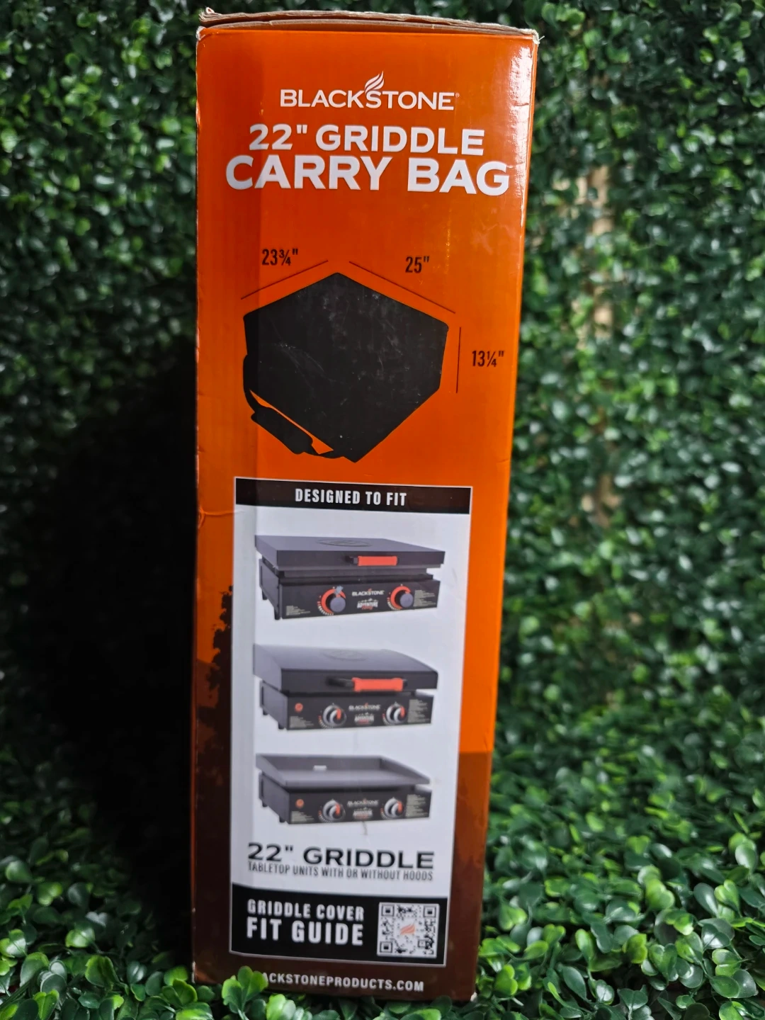 This Blackstone carry bag is designed for 22" griddle tabletop units. It features padded shoulder straps, an adjustable side strap, and is weather resistant. The dimensions are 23 1/4" Width x 25" Depth x 13 1/4" Height.
