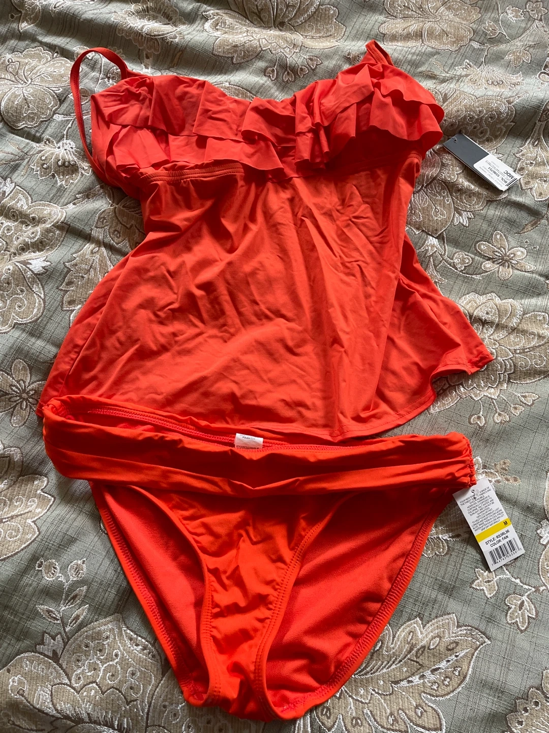 Selling a Kenneth Cole Reaction tankini in size M! It's a vibrant orange color and a stylish choice for swimwear. The style number is RS3RL96.