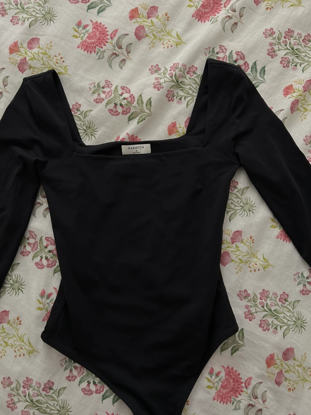 This is a black long-sleeve bodysuit from Babaton. It features a flattering square neckline. Material is a comfortable stretch blend.