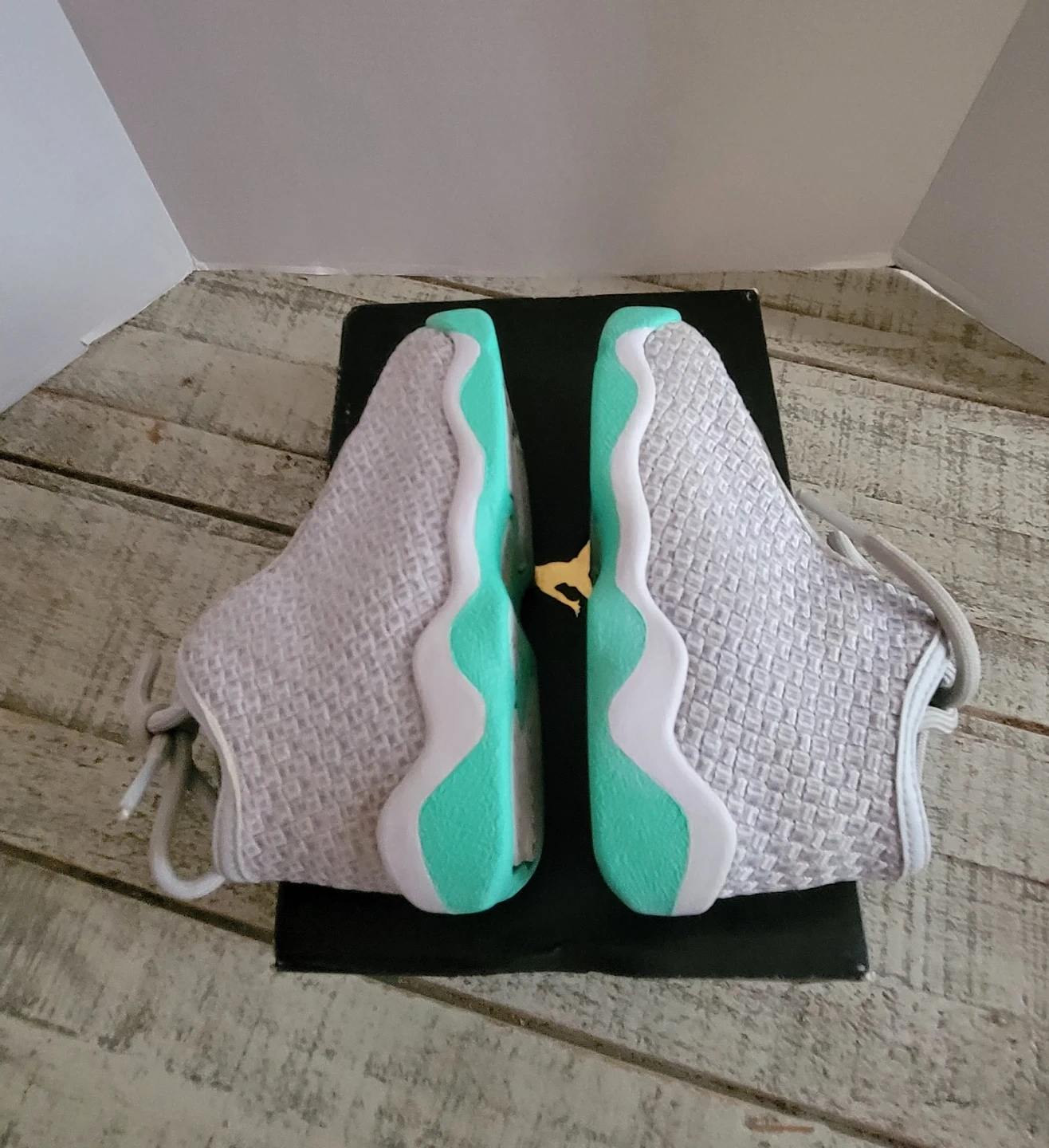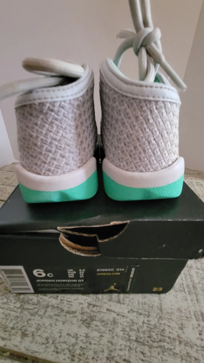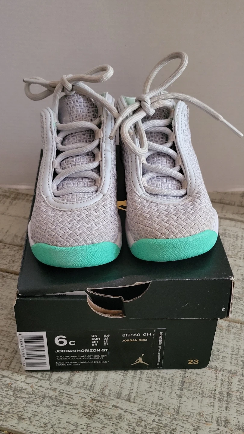 These are toddler Jordan Horizon GT shoes in a size 6C. They're a gray and mint colorway. Includes original box.