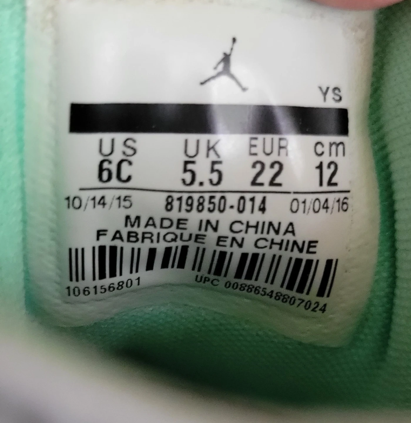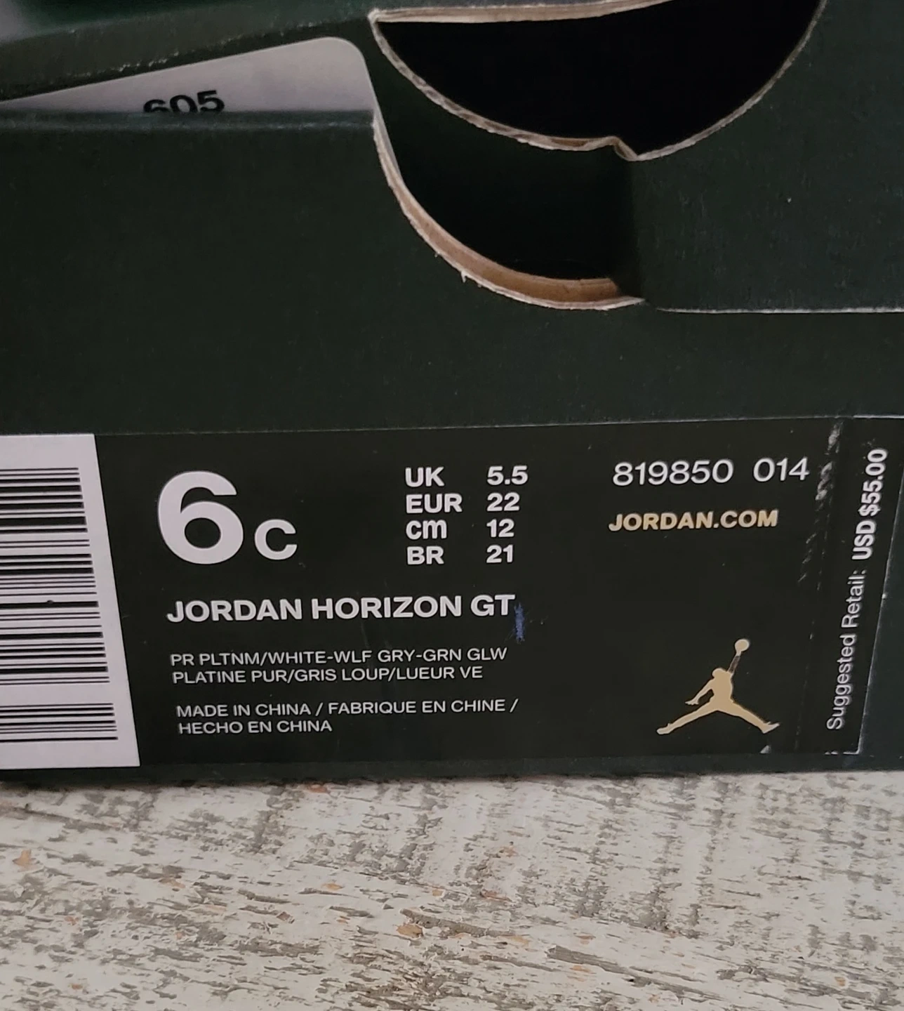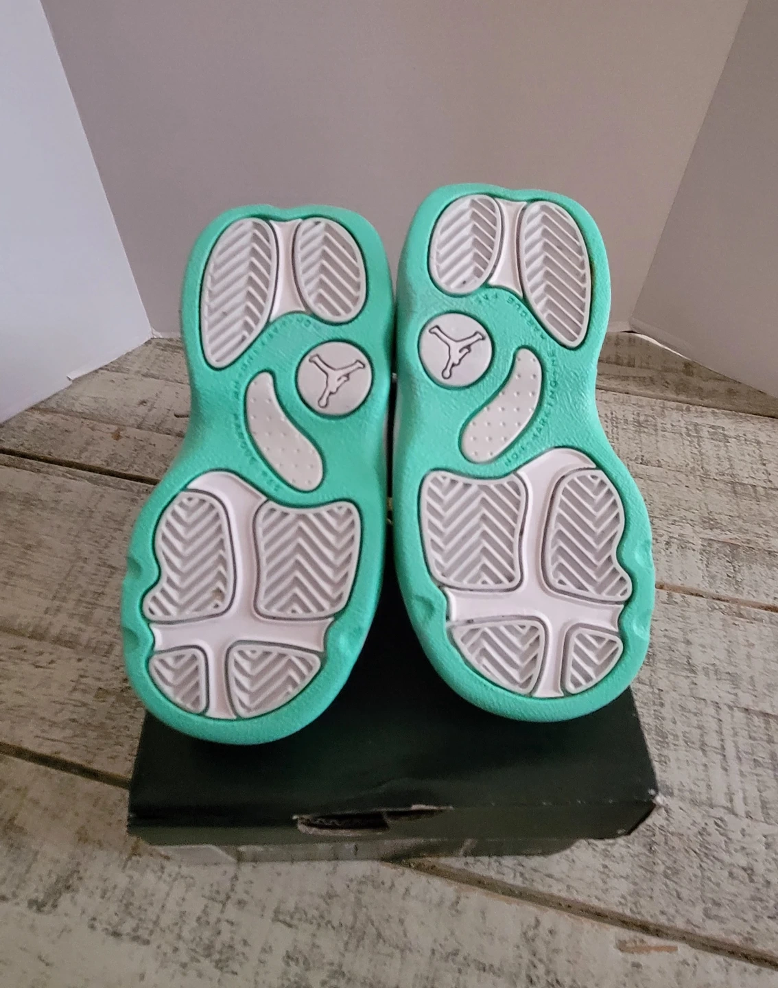 These are toddler Jordan Horizon GT shoes in a size 6C. They're a gray and mint colorway. Includes original box.
