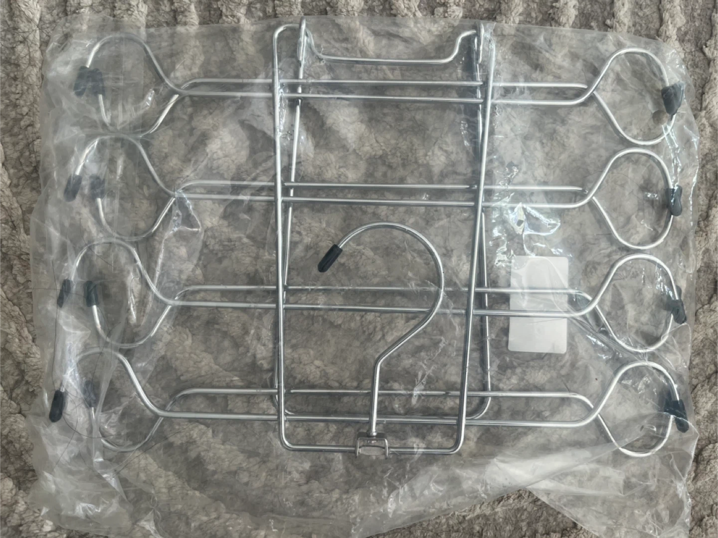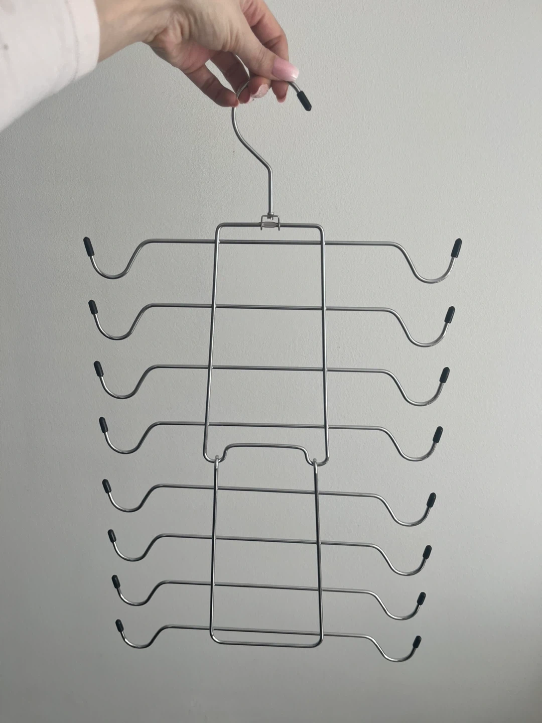 This multi-tier pants hanger is made of durable metal. It's designed to hold multiple pairs of pants or scarves. This hanger is great for saving closet space and keeping your clothes organized!