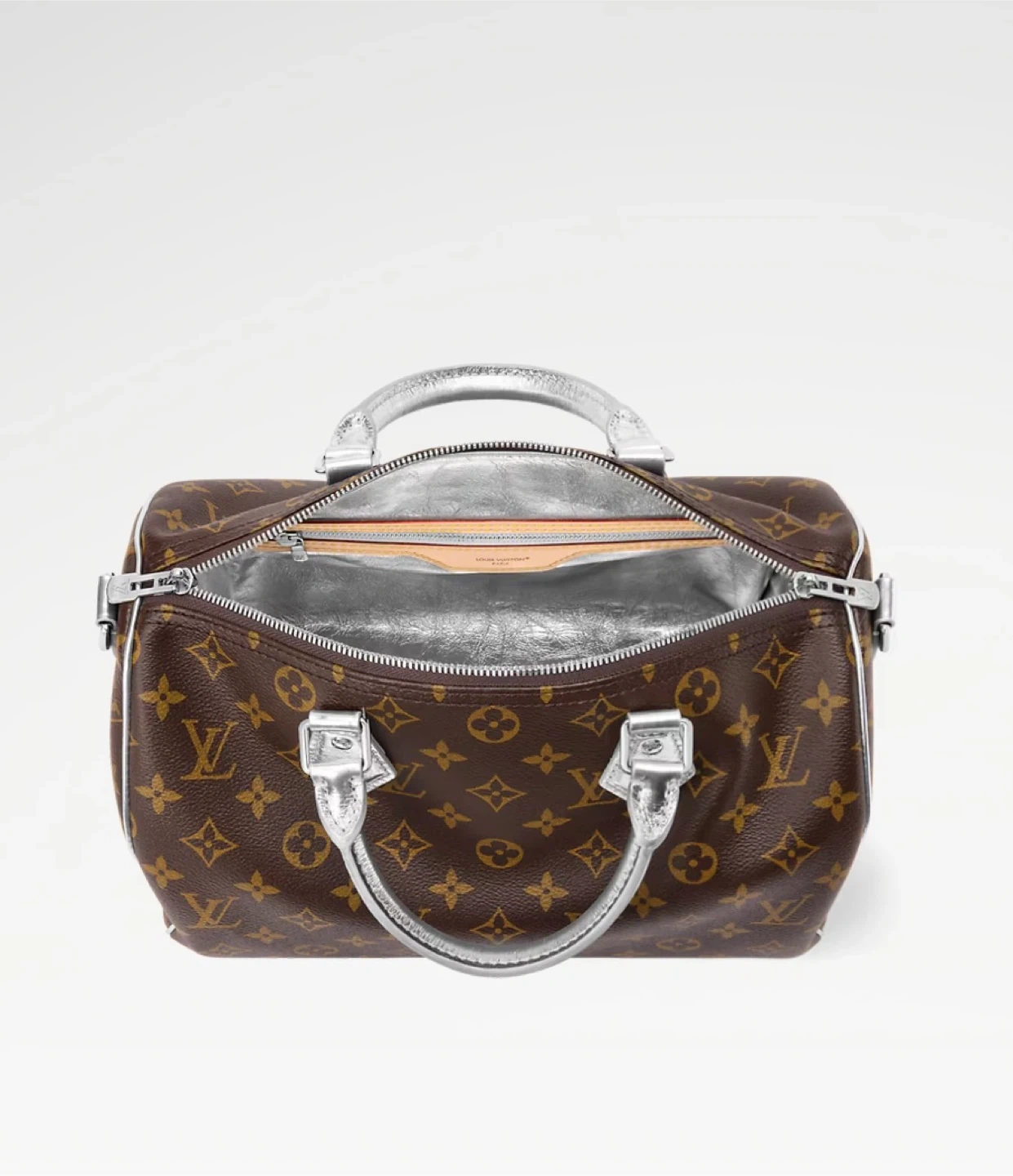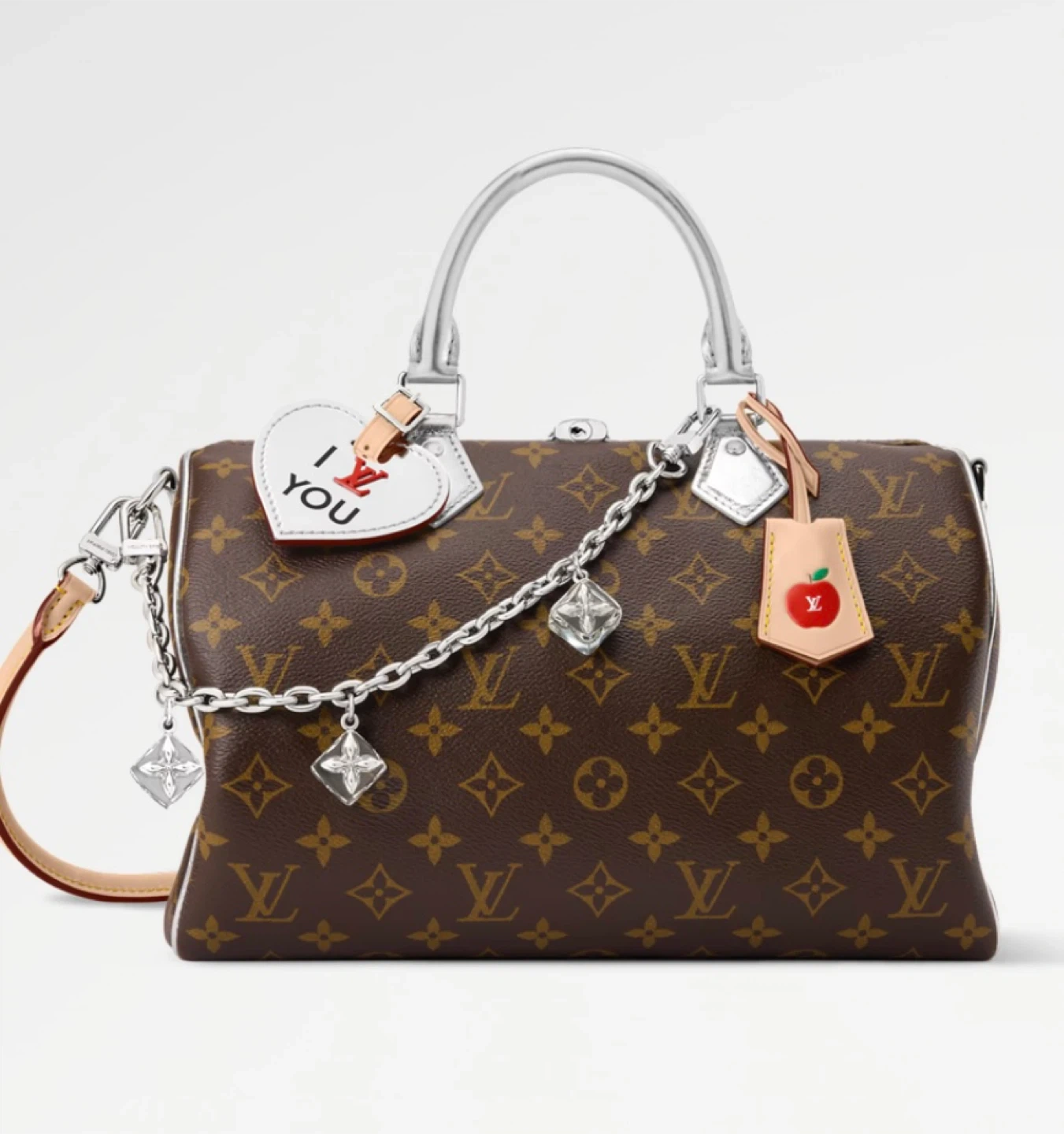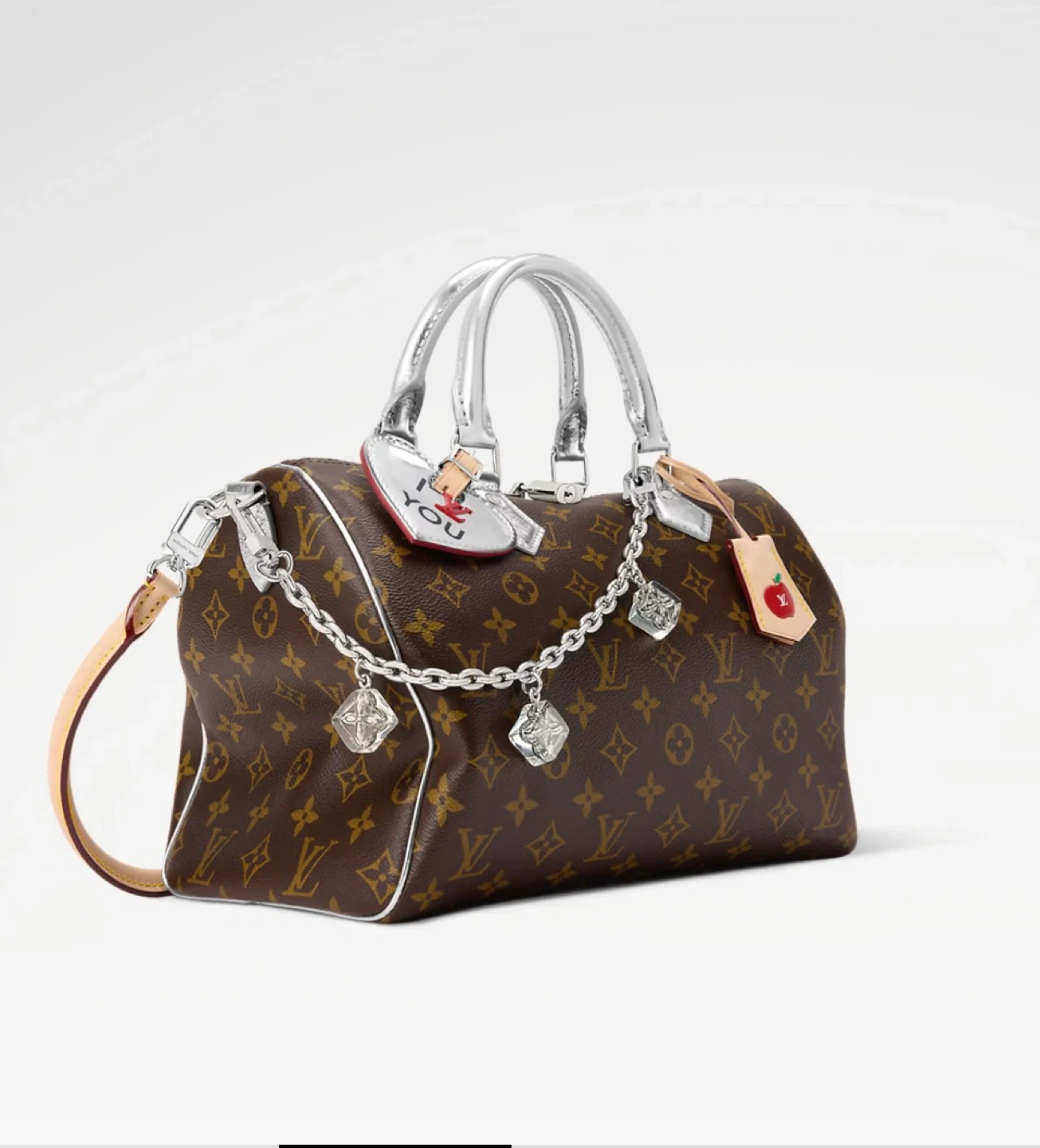 This Louis Vuitton Speedy bag features the iconic monogram canvas with silver handles and trim. It comes with decorative charms including a heart with 'I YOU' and an apple tag. The interior is lined in a silver material.