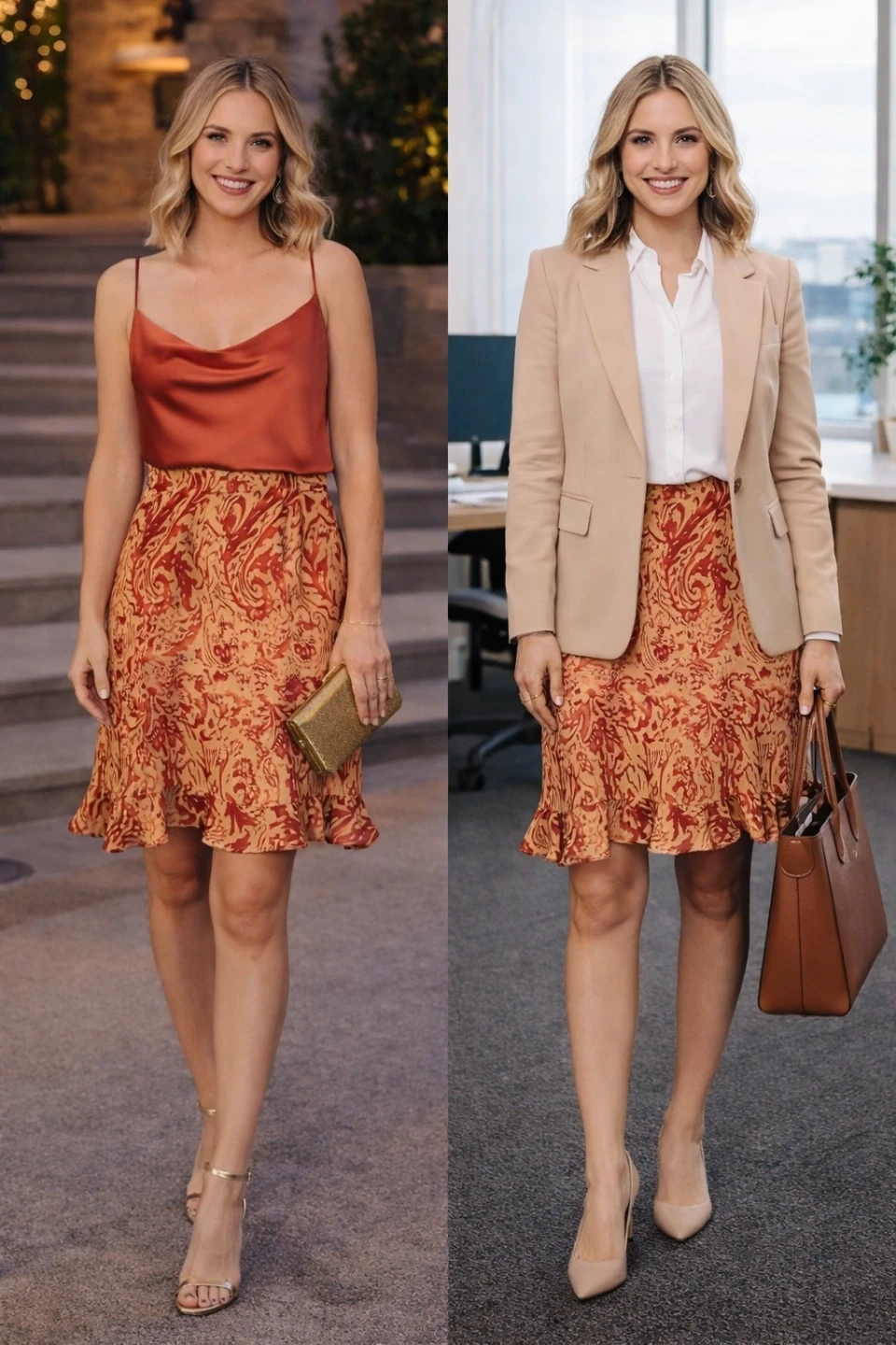 A stylish women's skirt from Quintieri, featuring a lovely all-over print and a ruffled hem. This skirt is perfect for dressing up or down! ππ #Skirt #Fashion #Style #madeincanada