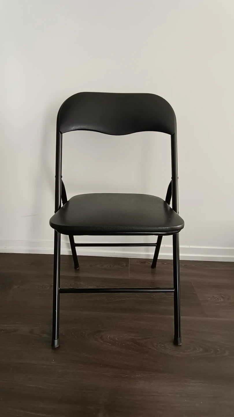 This is a black folding chair. It has a durable metal frame and a padded seat and back for comfort. It folds flat for easy storage.