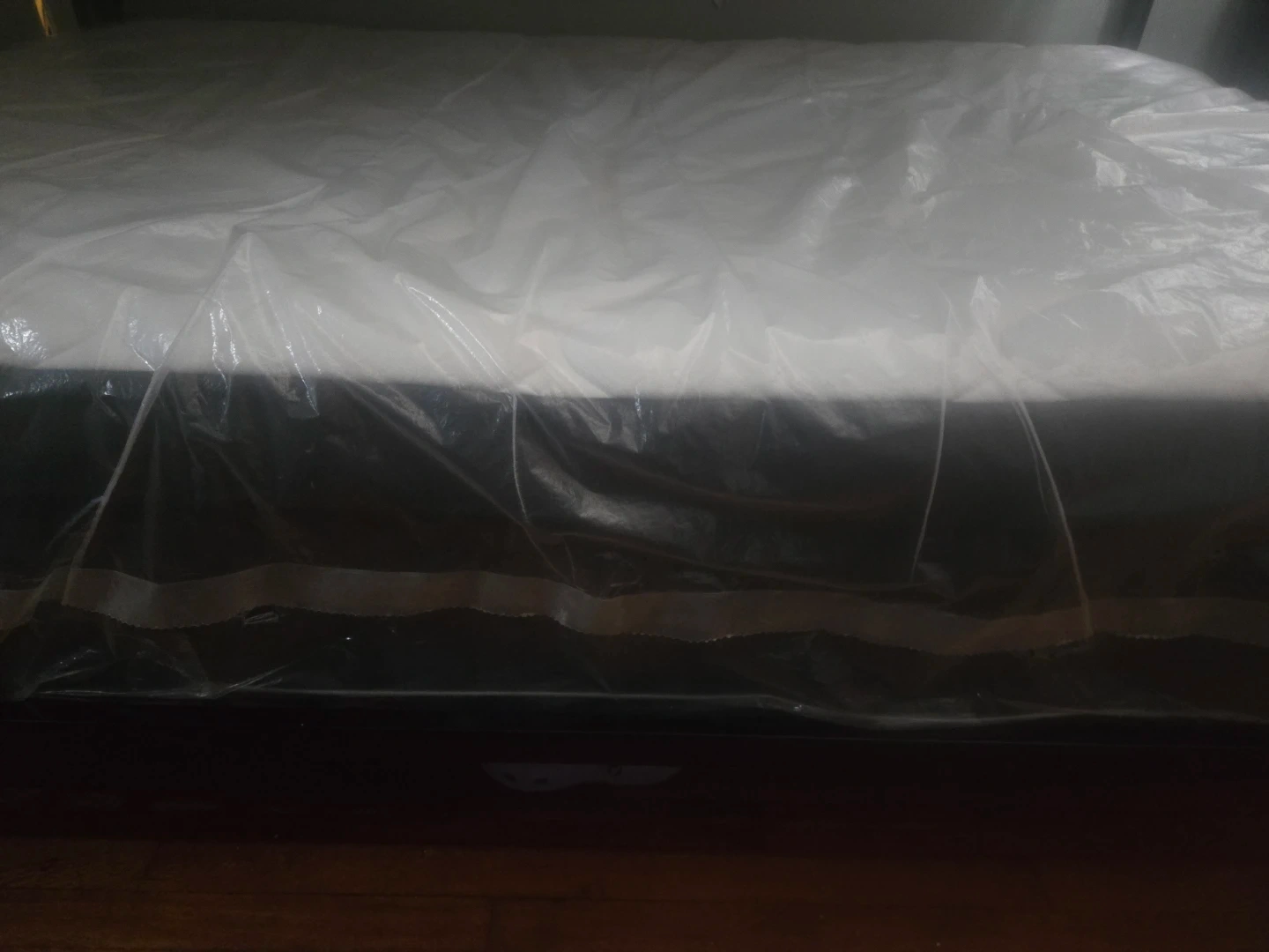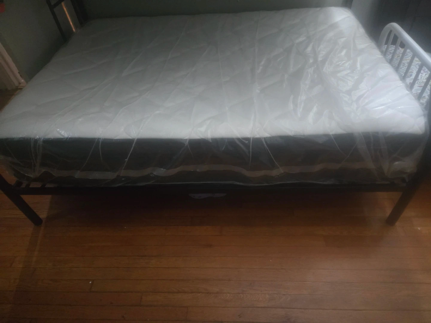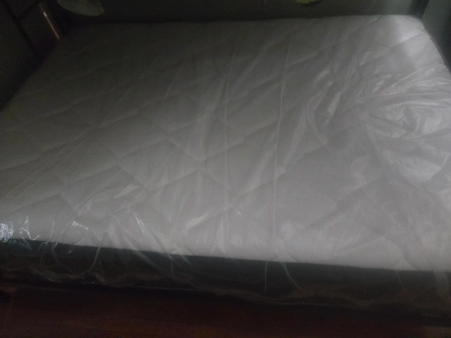This is a mattress still in its protective plastic wrap. It's a standard size with a quilted top. This mattress provides a comfortable sleeping surface.