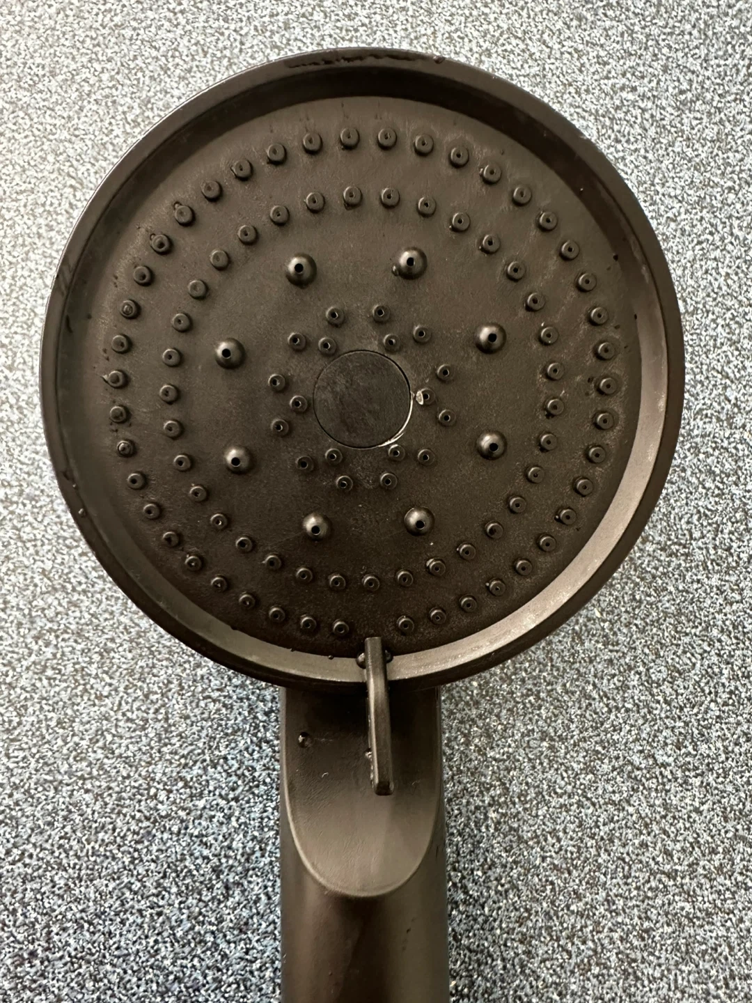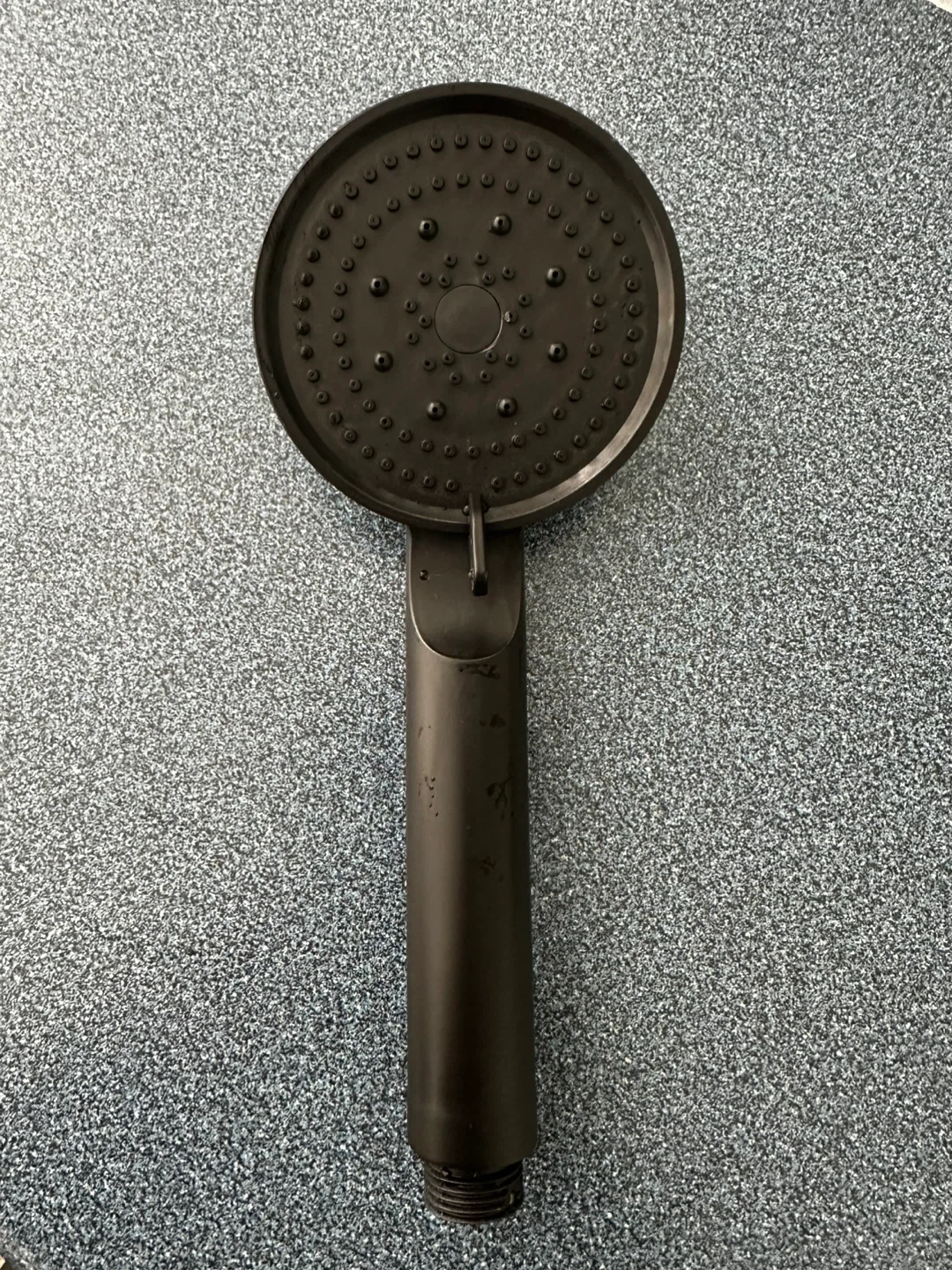 This black handheld shower head is made of durable plastic. It has multiple spray settings for a customizable shower experience.