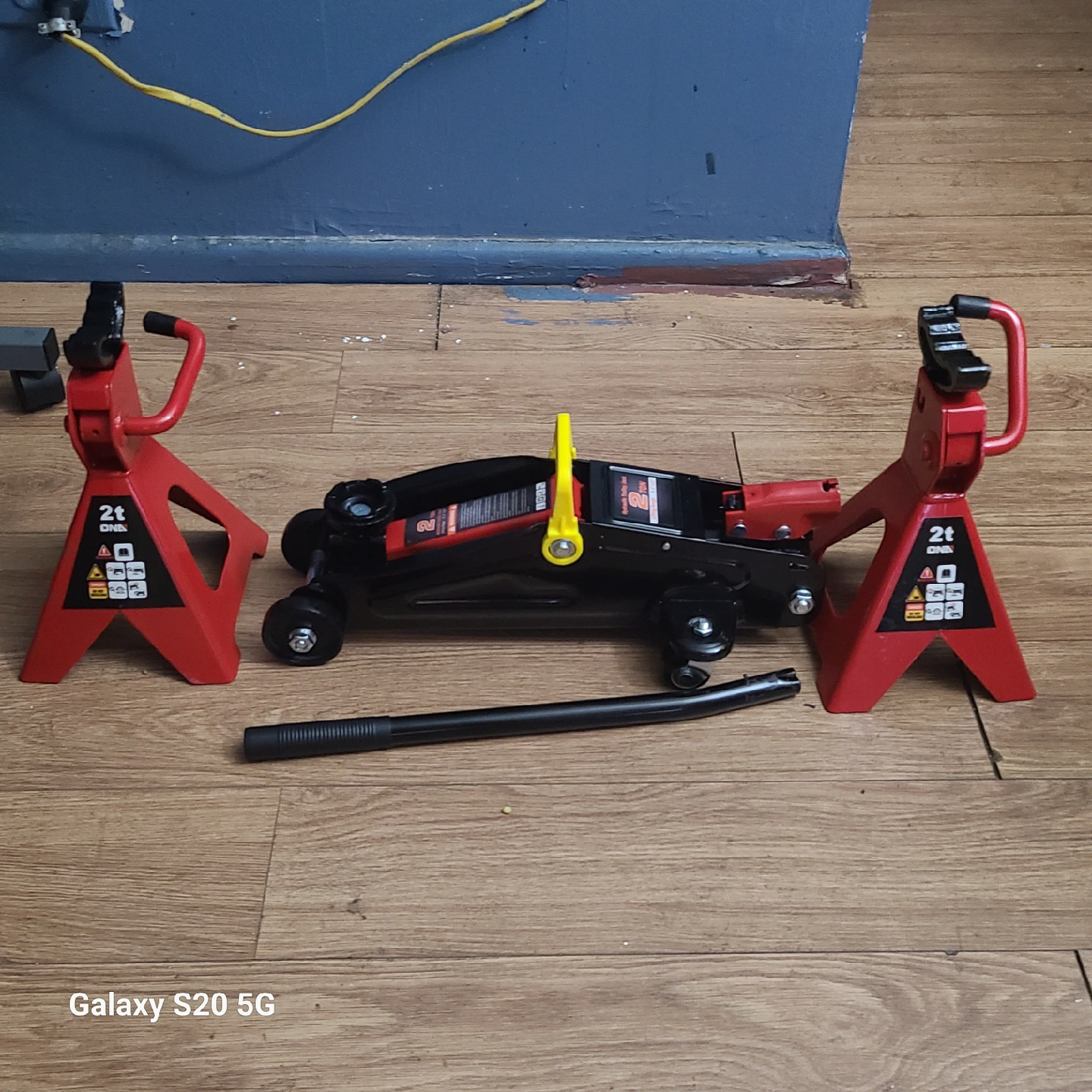 Selling a 2T hydraulic floor jack along with a pair of 2T jack stands. Perfect for car maintenance and repairs. Includes the jack handle as well. Never used....